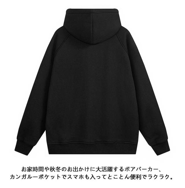 | もこもこあったか裏ボアパーカー。ハイネックでかっこいい! マフラーいらず首元も暖かいハイネックフード、小顔効果も◎ ふわふわとろけるようなボアフリースで極暖!この秋冬はもう手放せない。 お家時間や秋冬のお出かけに大活躍するボアパーカー、カンガルーポケットでスマホも入ってとことん便利でラクラク。 ユニセックスで着られるゆるっとしたサイズ感と、シンプルなデザインが魅力。大切な人と共有して一緒にお洒落を楽しめます。 | |