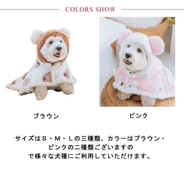 | 秋冬〜春先などの寒い日にお使いいただける犬用のブランケットです。ワンちゃんのポンチョやマントみたいにお使い頂けます。 寒い日の防寒着として可愛く着れる犬の服です。ふかふかのブランケットでワンちゃん猫ちゃんなどのペットを優しく包み込みます。 前側のボタンで留めて使うので使いやすいブランケットとなっております。くまちゃんのデザインや耳付きのフードでかわいいデザインとなっております。 お出かけ先などで急に寒くなった時など犬用の服ではないのでワンちゃんに直ぐに羽織ってあげれます。着せる手間などがございません。 サイズはS・M・Lの三種類、カラーはブラウン・ピンクの二種類ございますので様々な犬種にご利用していただけます。 部屋着やお散歩、ドッグラン、ドッグカフェなどのお出かけ時など様々な場面でお使いいただけます。 | |