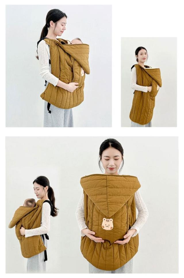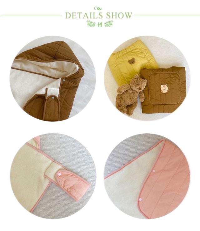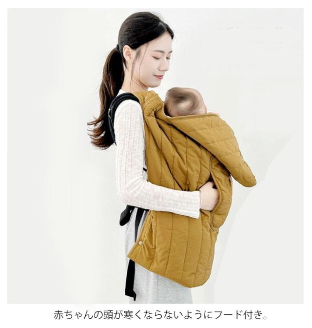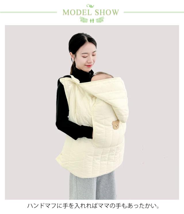 | 内側下部はポケット状になっているので赤ちゃんの足元をすっぽり包み込んで温めます。 ハンドマフに手を入れればママの手もあったかい。 抱っこ紐やベビーカーに取り付けしやすい仕様。 赤ちゃんの頭が寒くならないようにフード付き。 裏地はボア素材で肌触りもあたたかさも抜群。 | |