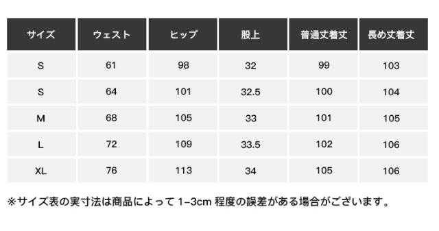 | サイズについての説明 | XS ウェスト61 ヒップ98 股上32 普通丈着丈99 長め丈着丈103 S ウェスト64 ヒップ101 股上32.5 普通丈着丈100 長め丈着丈104 M ウェスト68 ヒップ105 股上33 普通丈着丈101 長め丈着丈105 L ウェスト72 ヒップ109 股上33.5 普通丈着丈102 長め丈着丈106 XL ウェスト76 ヒップ113 股上34 普通丈着丈102 長め丈着丈106 ※サイズ表の実寸法は商品によって1-3cm程度の誤差がある場合がございます。 |