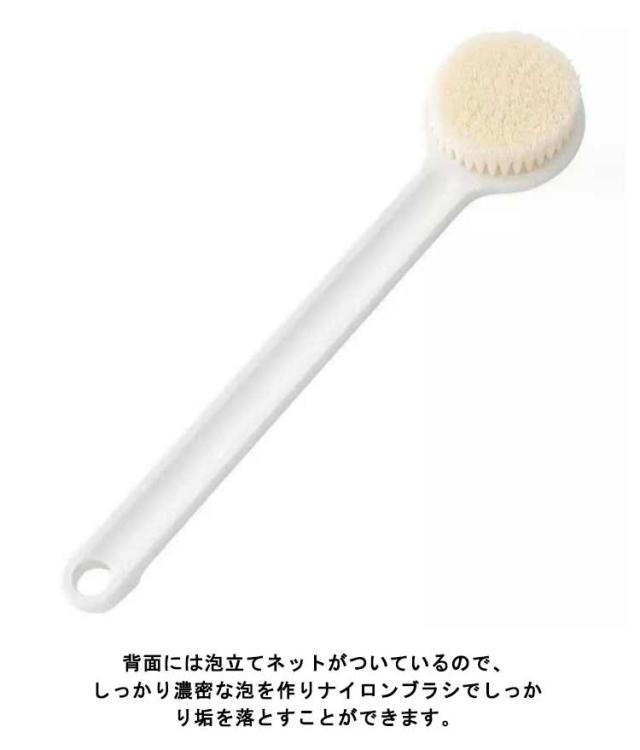 | 柔らかな高品質ナイロンブラシを採用 ヘッド部分には、高品質なナイロンブラシを採用することで、一般的な動物毛よりも衛星面、耐久性、弾力性に優れています。 &角質除去 の効果も期待でき、背中にきびが気になる方にもおすすめです。また、足の裏の角質除去にも利用できます。 泡立てネット付きで最高の泡体験! 背面には泡立てネットがついているので、しっかり濃密な泡を作りナイロンブラシでしっかり垢を落とすことができます。 | |