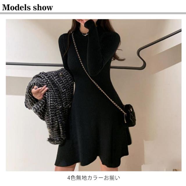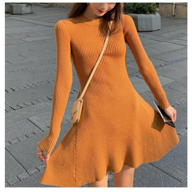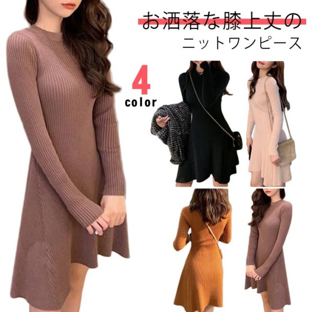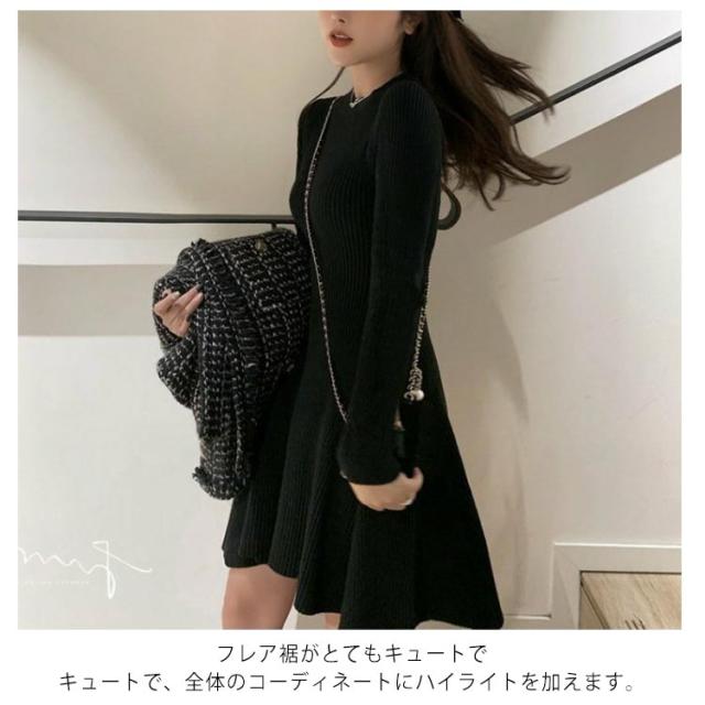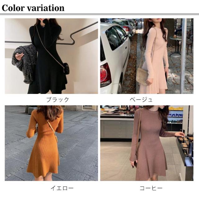 スリム フレア レディース ニットワンピース フレア裾 長袖 リブ 膝丈ニットワンピ 膝上丈ワンピース 無地 ワンピース ラウンドネック インナー リブニット スリム オシャレ かわいい ニットワンピース 韓国
