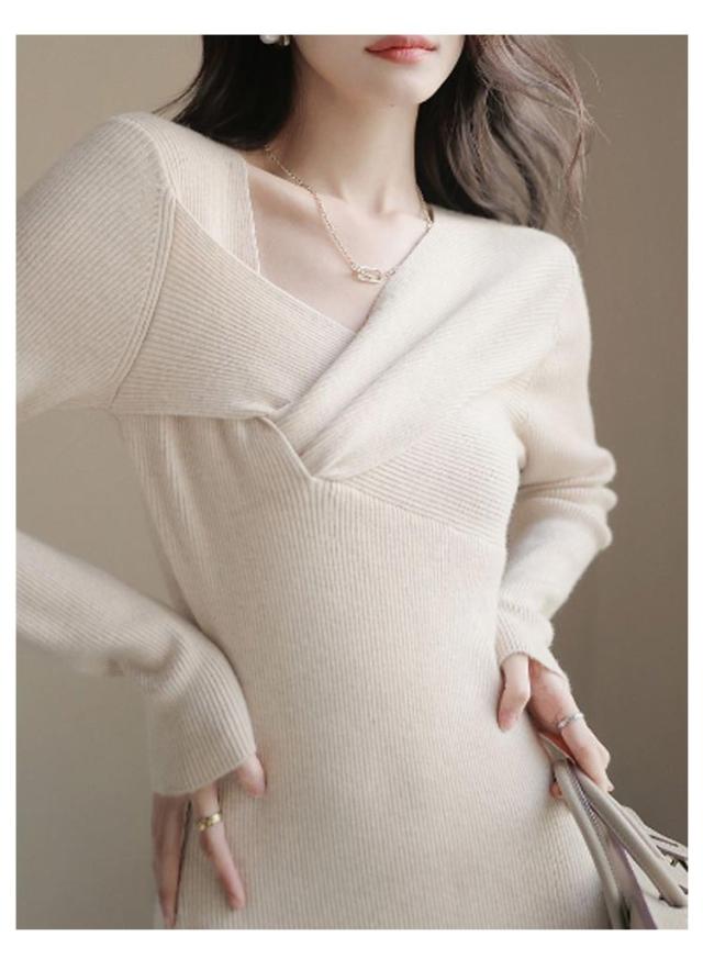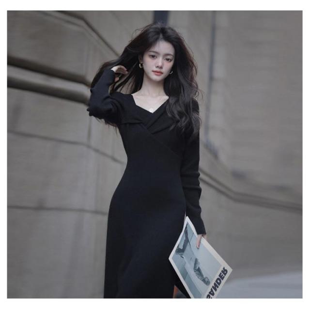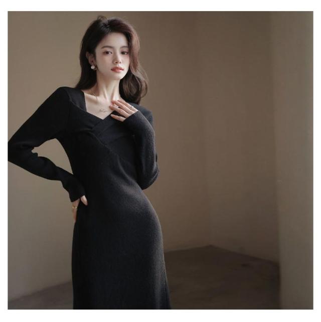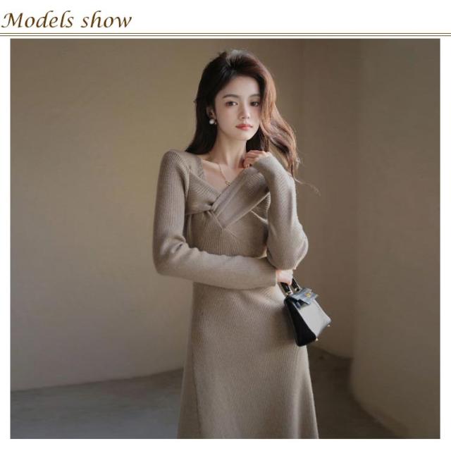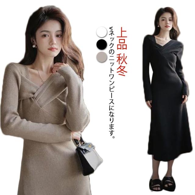 ミモレ丈 デイリー フロントクロス 全3色 シンプル ロングワンピース 長袖 ニットワンピース スリム ロング丈 ニットワンピース きれいめ 黒 Aライン 上品 エレガント リブニット 大人可愛い デート クリスマス オフィスカジュアル 通勤 秋冬
