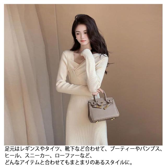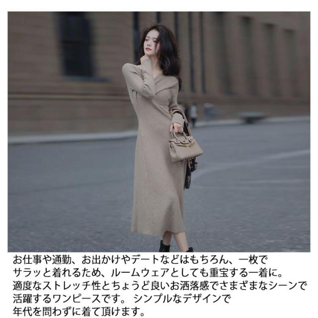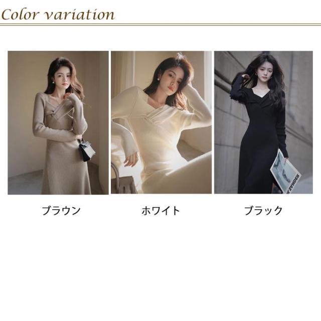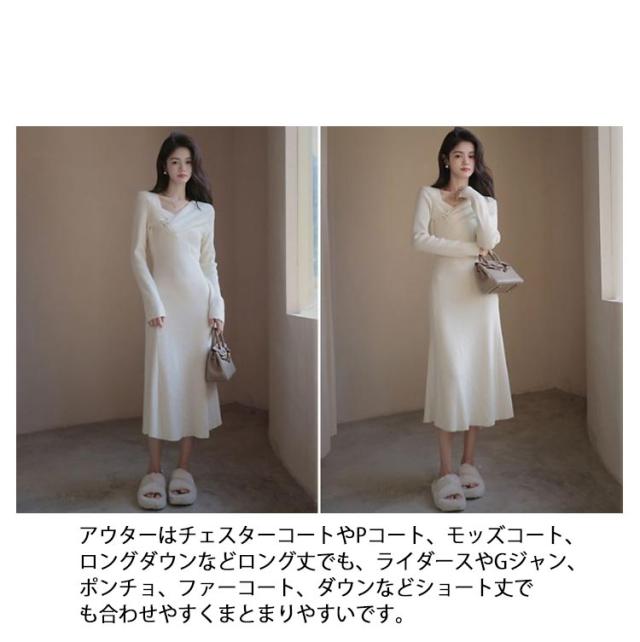 | vネックのニットワンピースになります。 タイトめなシルエットと、ウエスト切り替えデザインで、スタイル良くお洒落な印象に。 お色味は合わせやすく、使いやすいブラックとホワイトの2色をご用意いたしました。 太めのリブ素材やウエストまでのフロントボタン、ウエストの切り替えデザインでシンプルすぎずに、サラッと着るだけでエレガントな印象に仕上げてくれます。デコルテがキレイ見えするvネックデザインで、重くなりがちな秋冬のコーディネートに適度な抜け感を出してくれるのも嬉しいポイントです。 お仕事や通勤、お出かけやデートなどはもちろん、一枚でサラッと着れるため、ルームウェアとしても重宝する一着に。適度なストレッチ性とちょうど良いお洒落感でさまざまなシーンで活躍するワンピースです。 シンプルなデザインで年代を問わずに着て頂けます。 コーディネートとしては、一枚でサラッと着て頂いても、インナーにレースキャミソールやベアトップ、ハイネックインナーなどと合わせても◎上からゆったりめなニットを重ねたり、カーディガンやコーディガンと合わせてもまとまりのあるスタイルになります。 アウターはチェスターコートやPコート、モッズコート、ロングダウンなどロング丈でも、ライダースやGジャン、ポンチョ、ファーコート、ダウンなどショート丈でも合わせやすくまとまりやすいです。 足元はレギンスやタイツ、靴下など合わせて、ブーティーやパンプス、ヒール、スニーカー、ローファーなど、どんなアイテムと合わせてもまとまりのあるスタイルに。 | |