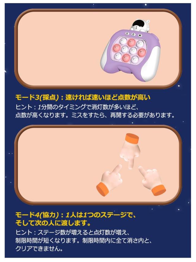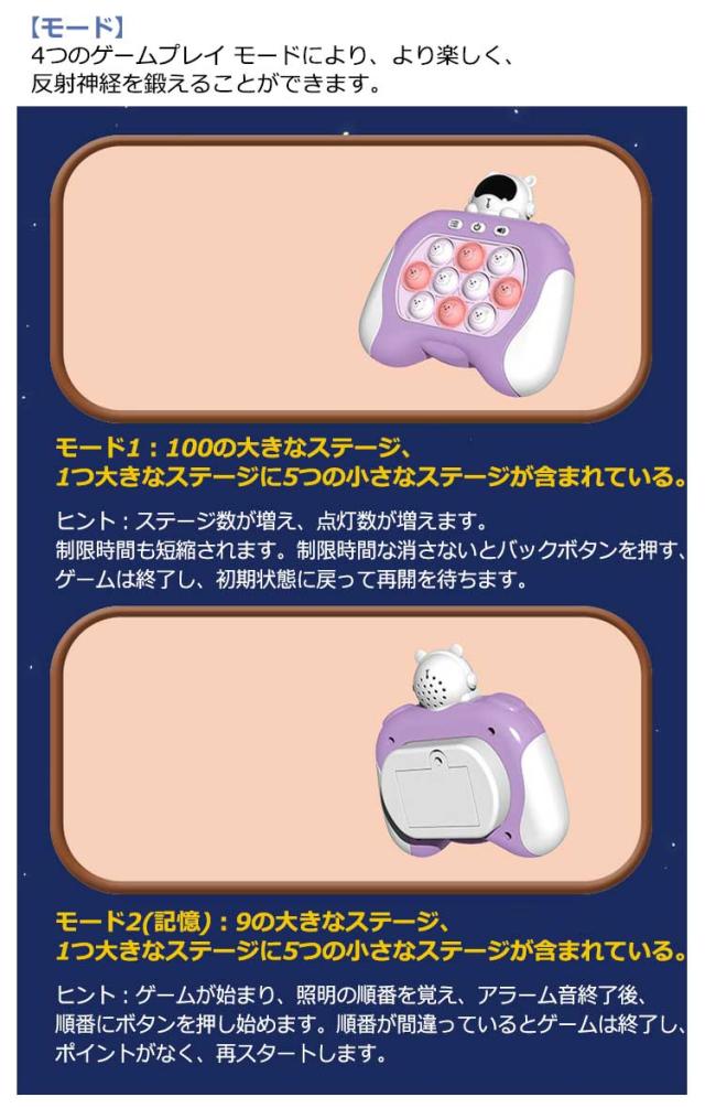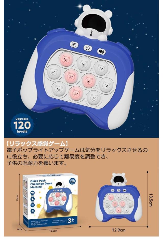 | 全20種類!男の子にも女の子にも目を引くおもちゃです。 【耐久性のある素材】高品質のABS素材で作られており、安全に使用でき、無臭です。また、柔軟性と柔らかさに優れており、快適で滑らかなタッチをもたらします。 【モード】4つのゲームプレイ モードにより、より楽しく、反射神経を鍛えることができます。 【操作能力の開発】このそわそわおもちゃは、お子様の創造性、手の柔軟性、思考能力、手と目の協調性を養うのに役立ちます。 【リラックス感覚ゲーム】電子ポップライトアップゲームは気分をリラックスさせるのに役立ち、必要に応じて難易度を調整でき、子供の忍耐力を養います。 【人気のゲーム機は】子供のパーティー、大人の会議、日常の仕事や生活など、さまざまなシナリオに適しており、一般の人々に適した幅広い人々に適用されます。 【ご注意】乾電池 利用必要です。(電池は付きません、別途でご購入ください。) | |