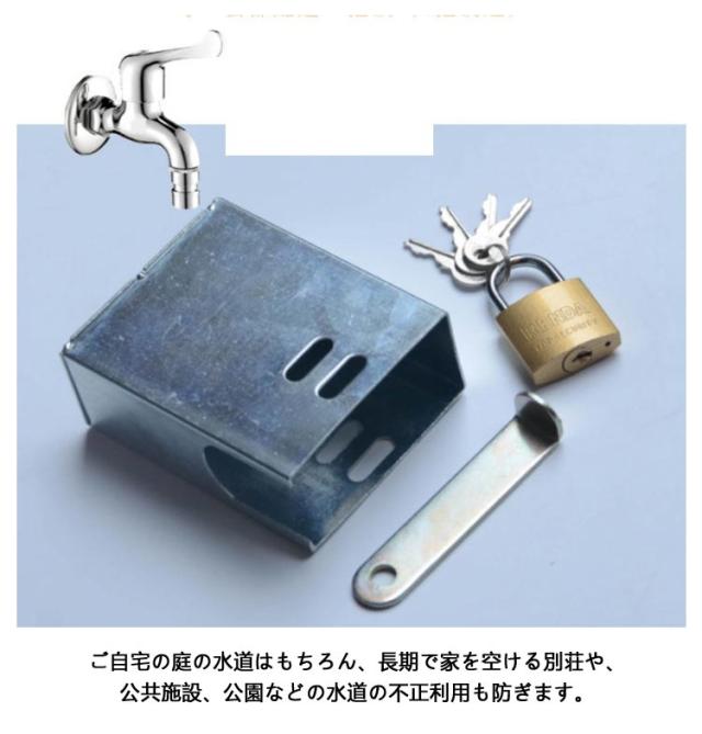 | 取り付け簡単!屋外水道のいたずらや不正使用を防ぐ蛇口ロックです。 屋外の水道のいたずら防止に!勝手に使われる不正使用もガード◎ 水道の蛇口部分にカバーをかぶせ、南京錠を取り付けてロックするだけ。 特別な工具は一切不要。誰でも無理なく取りつけて使用できます。南京錠にはスペアキー付き! カバーは、蛇口部分にすっぽりかぶせるタイプ。一般的な蛇口のどの形状にも対応可能。 ご自宅の庭の水道はもちろん、長期で家を空ける別荘や、公共施設、公園などの水道の不正利用も防ぎます。 | |