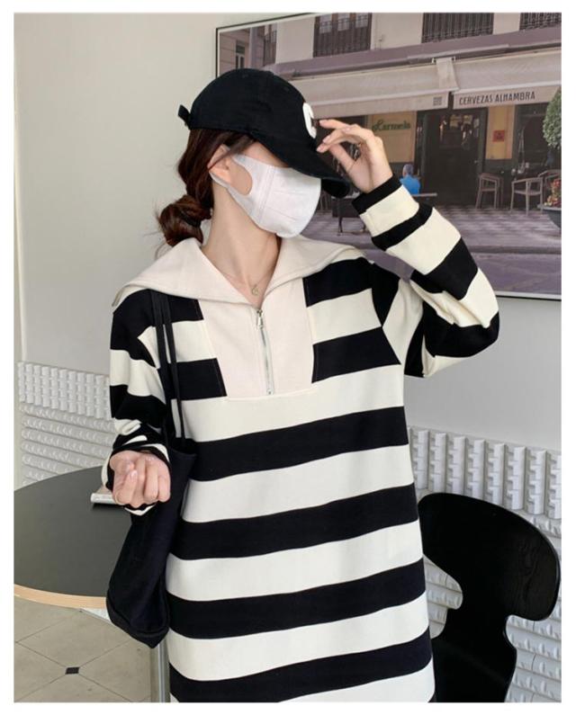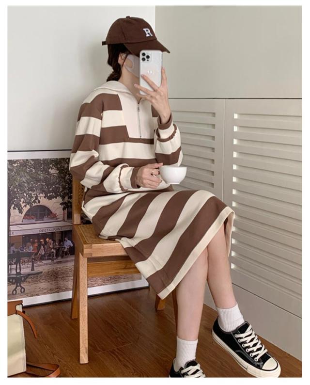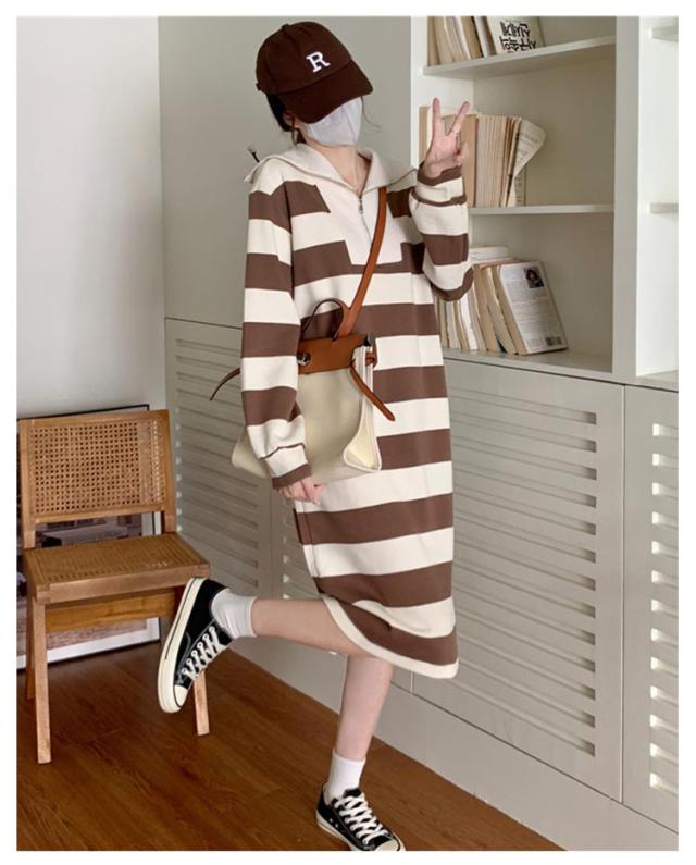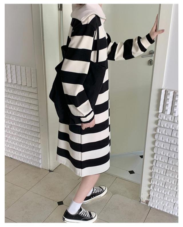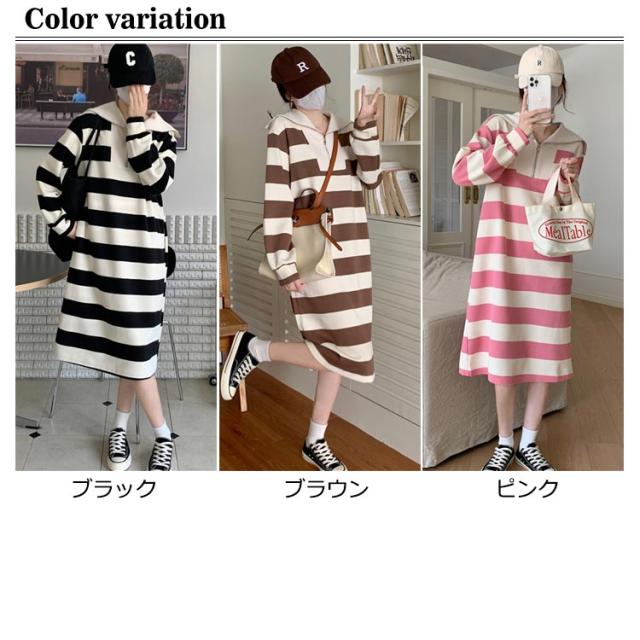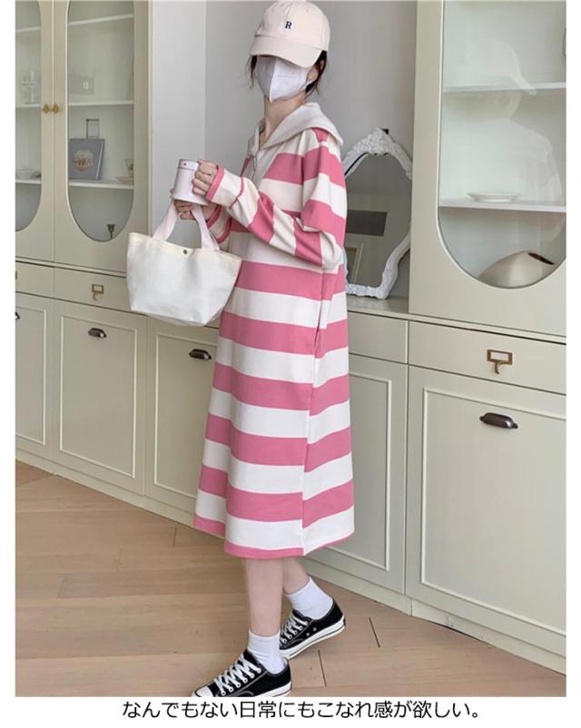 ワンピース セーラーネック ストライプ レディース ポッケト ロング丈 長袖 ミモレ丈 ボーダー セーラー ワンピ 長袖 綿混 裏毛 ふんわり ワンピース 無地 ゆったり 秋 冬 インナー ルームウェア