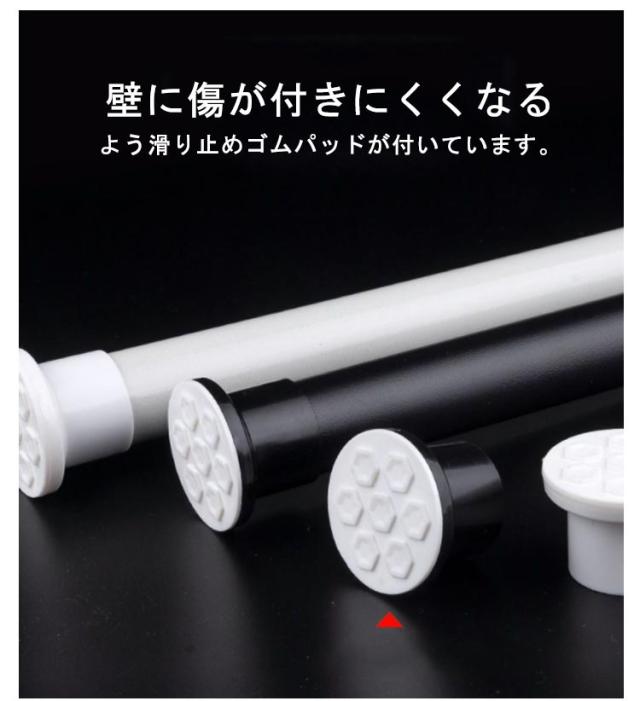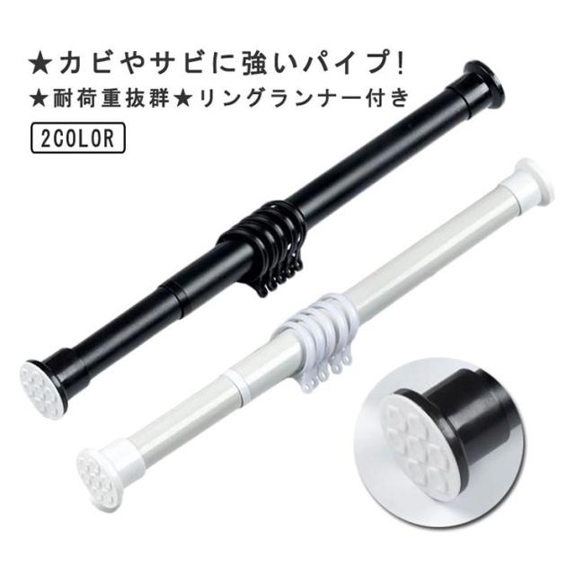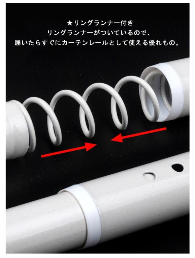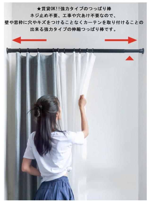 | ★賃貸OK!!強力タイプのつっぱり棒 ネジ止め不要、工事や穴あけ不要なので、壁や窓枠に穴やキズをつけることなくカーテンを取り付けることの出来る強力タイプの伸縮つっぱり棒です。 壁に傷が付きにくくなるよう滑り止めゴムパッドが付いています。 ★耐荷重抜群 つっぱり棒は鉄製で、強い負荷に耐えられます。強度の強いバネを使用しているのでしっかりと固定することができます。 ★カビやサビに強いパイプ! 塗装を施した鉄製のパイプですので、錆やカビに強く、湿気の多い浴室でも安心して使えます。 ★リングランナー付き リングランナーがついているので、届いたらすぐにカーテンレールとして使える優れもの。 ★デッドスペースを有効活用 つっぱり棒は自由に長さが調節でき、どこにでも設置でき、狭いスペースはもちろん、家の中のデッドスペースにも使えます。洗濯物を室内で干す、廊下でも部屋干し、ベランダの外に干す、つっぱり棒、クローゼットロッド、浴室用タオル掛け、室内用カーテンロッド、シャワーカーテンロッド、布団干し、物干し竿、キッチン用品収納。 | |
