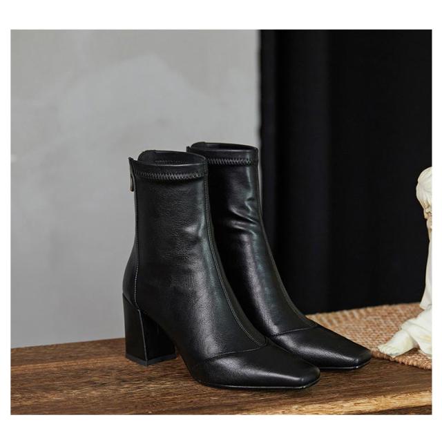 ショートブーツ レディース 歩きやすい スクエアトゥ ストレッチブーツ 痛くない チャンキーヒール ローヒール スムース バックファスナー ブーツ 22cm 24.5cm 太ヒール 柔らか ショートブーツ ソフト 履きやすい 柔らかい