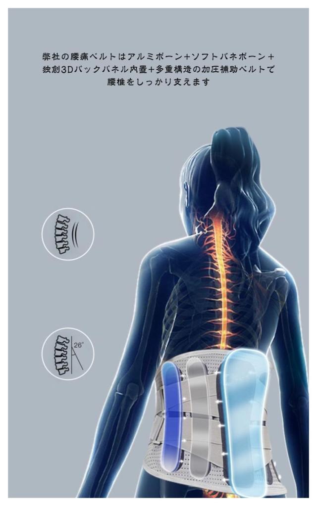 | 腰用ベルトは二重加圧式で腰椎をしっかり支えます。労働保護、日常腰サポートに適して、また、長座するサラリーマン、運搬作業、スポーツ、捻挫とぎっくり腰、長時間運転などの場合も使えます。 【ダブル加圧対策】腹部加圧ベルトを着けることで内蔵が上がり血流がよくなる事で、予防、新陳代謝がよくなります。 【強力加圧】弊社の腰痛ベルトはアルミボーン+ソフトバネボーン+独創3Dバックパネル内置+多重構造の加圧補助ベルトで腰椎をしっかり支えます。 【ダイエット、加圧効果】内蔵が上に上がる為、ウエストが細くなり、歩いている途中でもっときつく縛ると効果がアップします。 【腰のお悩み一発改善!】着けてみると実感、体が喜ぶ骨盤ベルトです。骨盤矯正、ぎっくり腰、猫背、くびれ、 、肩こり、あらゆる悩みを一発改善のお声を多数頂いてます。 【腰部疲労防止】通常の状態だと足だけに負担がかかりますが、ベルトを使用する事で身体全体を使うので疲れにくくなります。 【姿勢改善】一番の長所はしっかりと「姿勢が良くなる」ことです。 理由は骨盤が元々あった正常な位置に戻る為です。 【背もたれ不要】座った状態でも姿勢が良くなり、背もたれは要りません。 360°メッシュ構造で蒸れにくい通気形状 メッシュ部分は特殊編み加工が施され、 強度を保ちながら効率的に余分な熱を逃がします。本体の大半がメッシュ構造で薄型設計。 高品質なベルクロを採用され、繰り返し粘着しても起毛を防ぎ、スポーツや作業など激しい動きをしても崩れません、初心者でも簡単に手入れます。 わずか150-250グラムの軽量な作りになっております。(サイズによって異なります) | |