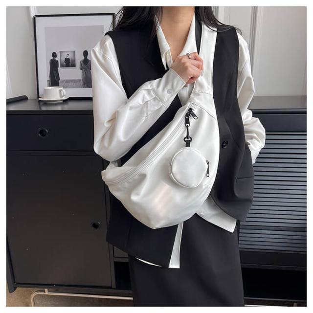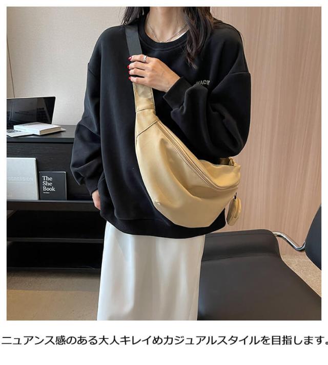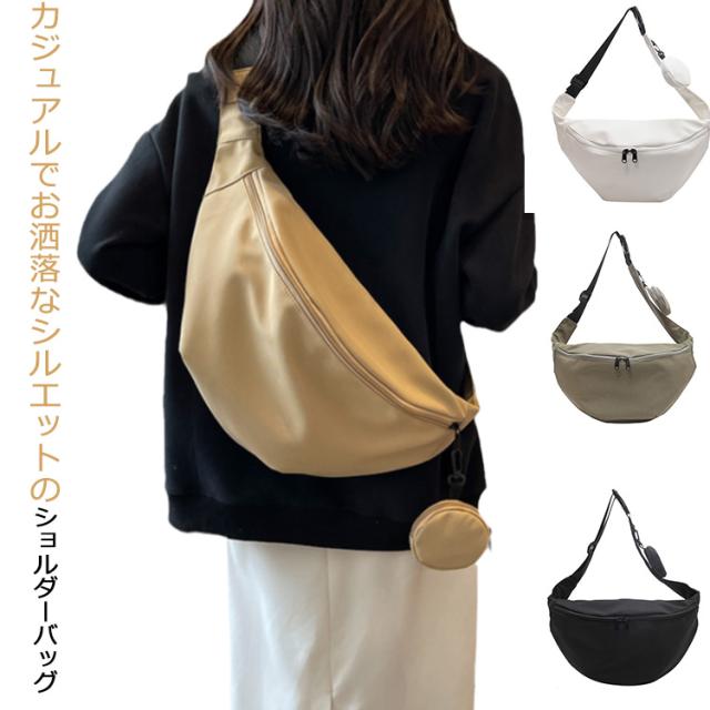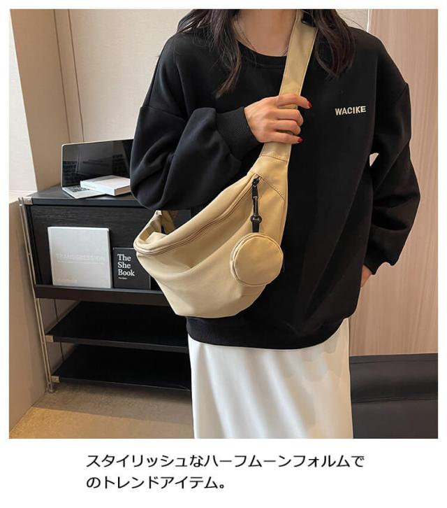 | カジュアルでお洒落なシルエットのショルダーバッグ スタイリッシュなハーフムーンフォルムで話題のトレンドアイテム。 ニュアンス感のある大人キレイめカジュアルスタイルを目指します。 開口部のファスナーは大きく開く仕様で物の出し入れもスムーズに。 ミニポーチ付き、イヤホン・鍵など小物の収納も便利♪ 学生さんから年配の方まで、幅広い年代にもご利用いただけます! | |