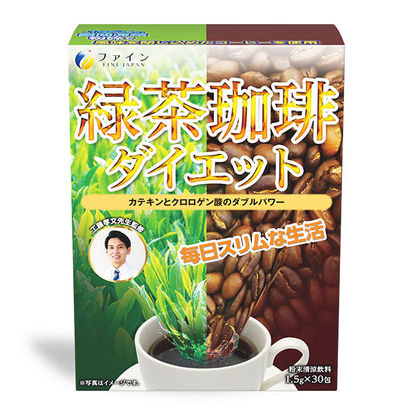 「ファイン 緑茶珈琲ダイエット 30包」は、医師・工藤孝文先生監修。コーヒーと緑茶をブレンドし、すっきり飲みやすい味わいに仕上げました。緑茶のカテキンと、コーヒーのクロロゲン酸、お茶とコーヒーの両方に含まれるカフェインで、頑張れない方のダイエットをサポートします。コーヒーの苦さが苦手な方にもおすすめ。