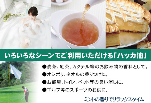 ●麦茶、紅茶、カクテル等のお飲み物の香料として、ようじの先がぬれた程度の少量を添加して下さい。 ●オシボリ、タオルにご使用の場合は、すすぎ時に2-3滴落としてご使用下さい。 ●お部屋、トイレ、ペット等の臭い消しに。 ●ゴルフ等のスポーツのお供に。 ●タバコのフィルターに1-2滴つけてメンソールタバコとしてお楽しみ頂けます。