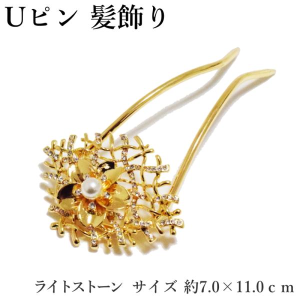 Uピン ライトストーン 髪飾り No.035 ゴールド(髪飾り パール ラインストーン 簪 かんざし ヘアピン 結婚式 入学式 卒業式 浴衣 和装)