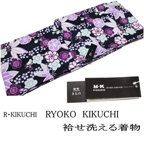 【在庫処分SALE】お仕立て上がり袷せ着物-No.055(地色:濃紺色/R・Kブランド/リョウコ・キクチ/リョウコキクチ/洗える・ポリエステル素材/紗綾形地紋入り)
