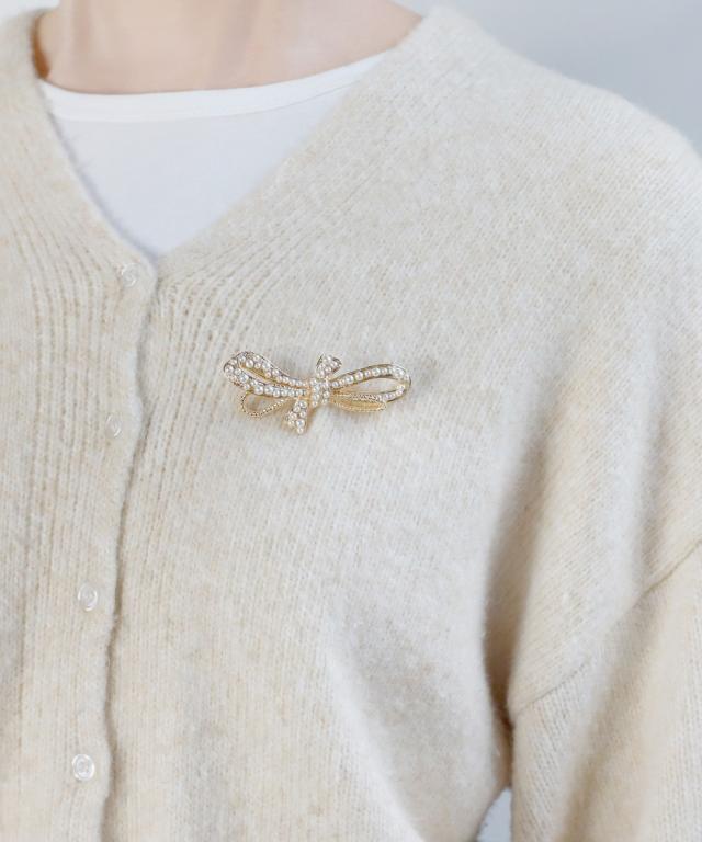 メタルのリボンモチーフが、女性らしい華やかな印象に仕上げるブローチ。