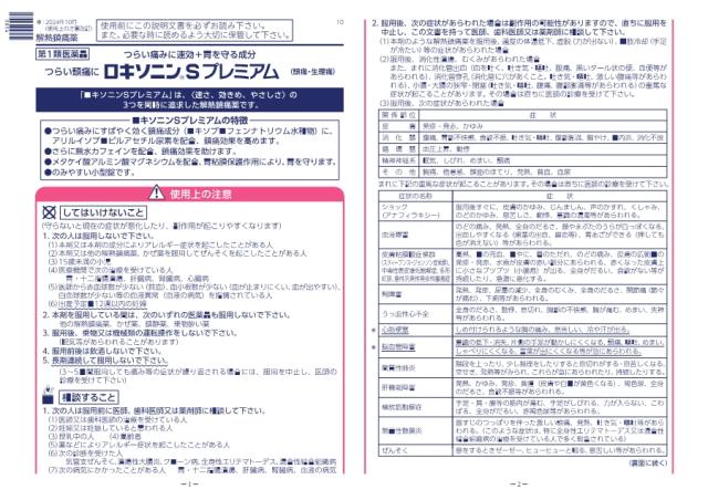 ■してはいけないこと (守らないと現在の症状が悪化したり、副作用が起こりやすくなります) 1.次の人は服用しないで下さい。 (1)本剤又は本剤の成分によりアレルギー症状を起こしたことがある人 (2)本剤又は他の解熱鎮痛薬、かぜ薬を服用してぜんそくを起こしたことがある人 (3)15歳未満の小児 (4)医療機関で次の治療を受けている人 胃・十二指腸潰瘍、肝臓病、腎臓病、心臓病 (5)医師から赤血球数が少ない(貧血)、血小板数が少ない(血が止まりにくい、血が出やすい)、白血球数が少ない等の血液異常(血液の病気)を指摘されている人 (6)出産予定日12週以内の妊婦 2.本剤を服用している間は、次のいずれの医薬品も服用しないで下さい。 他の解熱鎮痛薬、かぜ薬、鎮静薬、乗物酔い薬 3.服用後、乗物又は機械類の運転操作をしないで下さい。 (眠気等があらわれることがあります) 4.服用前後は飲酒しないで下さい。 5.長期連続して服用しないで下さい。 (3〜5日間服用しても痛み等の症状が繰り返される場合には、服用を中止し、医師の診療を受けて下さい) ■相談すること 1.次の人は服用前に医師、歯科医師又は薬剤師に相談して下さい。 (1)医師又は歯科医師の治療を受けている人 (2)妊婦又は妊娠していると思われる人 (3)授乳中の人 (4)高齢者 (5)薬などによりアレルギー症状を起こしたことがある人 (6)次の診断を受けた人 気管支ぜんそく、潰瘍性大腸炎、クローン病、全身性エリテマトーデス、混合性結合組織病 (7)次の病気にかかったことがある人 胃・十二指腸潰瘍、肝臓病、腎臓病、血液の病気 2.服用後、次の症状があらわれた場合は副作用の可能性がありますので、直ちに服用を中止し、この文書を持って医師、歯科医師又は薬剤師に相談して下さい。 (1)本剤のような解熱鎮痛薬を服用後、過度の体温低下、虚脱(力が出ない)、四肢冷却(手足が冷たい)等の症状があらわれた場合 (2)服用後、消化性潰瘍、むくみがあらわれた場合 また、まれに消化管出血(血を吐く、吐き気・嘔吐、腹痛、黒いタール状の便、血便等があらわれる)、消化管穿孔(消化管に穴があくこと。吐き気・嘔吐、激しい腹痛等があらわれる),小腸・大腸の狭窄・閉塞(吐き気,嘔吐,腹痛,腹部膨満等があらわれる)の重篤な症状が起こることがあります。その場合は直ちに医師の診療を受けて下さい。 (3)服用後、次の症状があらわれた場合 [関係部位:症状] 皮膚:発疹・発赤、かゆみ 消化器:腹痛、胃部不快感、食欲不振、吐き気・嘔吐、腹部膨満、胸やけ、口内炎、消化不良 循環器:血圧上昇、動悸 精神神経系:眠気、しびれ、めまい、頭痛 その他:胸痛、倦怠感、顔面のほてり、発熱、貧血、血尿 まれに次の重篤な症状が起こることがあります。その場合は直ちに医師の診療を受けて下さい。 [症状の名称:症状] ショック(アナフィラキシー):服用後すぐに、皮膚のかゆみ、じんましん、声のかすれ、くしゃみ、のどのかゆみ、息苦しさ、動悸、意識の混濁等があらわれる。 血液障害:のどの痛み、発熱、全身のだるさ、顔やまぶたのうらが白っぽくなる、出血しやすくなる(歯茎の出血、鼻血等)、青あざができる(押しても色が消えない)等があらわれる。 皮膚粘膜眼症候群(スティーブンス・ジョンソン症候群):高熱、目の充血、目やに、唇のただれ、のどの痛み、皮膚の広範囲の発疹・発赤、水疱が皮膚の赤い部分にあらわれる、赤くなった皮膚上に小さなブツブツ(小膿疱)が出る、全身がだるい、食欲がない等が持続したり、急激に悪化する。 中毒性表皮壊死融解症:高熱、目の充血、目やに、唇のただれ、のどの痛み、皮膚の広範囲の発疹・発赤、水疱が皮膚の赤い部分にあらわれる、赤くなった皮膚上に小さなブツブツ(小膿疱)が出る、全身がだるい、食欲がない等が持続したり、急激に悪化する。 多形紅斑:高熱、目の充血、目やに、唇のただれ、のどの痛み、皮膚の広範囲の発疹・発赤、水疱が皮膚の赤い部分にあらわれる、赤くなった皮膚上に小さなブツブツ(小膿疱)が出る、全身がだるい、食欲がない等が持続したり、急激に悪化する。 急性汎発性発疹性膿疱症:高熱、目の充血、目やに、唇のただれ、のどの痛み、皮膚の広範囲の発疹・発赤、水疱が皮膚の赤い部分にあらわれる、赤くなった皮膚上に小さなブツブツ(小膿疱)が出る、全身がだるい、食欲がない等が持続したり、急激に悪化する。 腎障害:発熱、発疹、尿量の減少、全身のむくみ、全身のだるさ、関節痛(節々が痛む)、下痢等があらわれる。 うっ血性心不全:全身のだるさ、動悸、息切れ、胸部の不快感、胸が痛む、めまい、失神等があらわれる。 心筋梗塞:しめ付けられるような胸の痛み、息苦しい、冷や汗が出る。 脳血管障害:意識の低下・消失、片側の手足が動かしにくくなる、頭痛、嘔吐、めまい、しゃべりにくくなる、言葉が出にくくなる等が急にあらわれる。 間質性肺炎:階段を上ったり、少し無理をしたりすると息切れがする・息苦しくなる、空せき、発熱等がみられ、これらが急