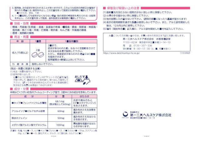 会社名:第一三共ヘルスケア株式会社 住所:〒103-8234 東京都中央区日本橋3-14-10 問い合わせ先:お客様相談室 電話:0120-337-336
