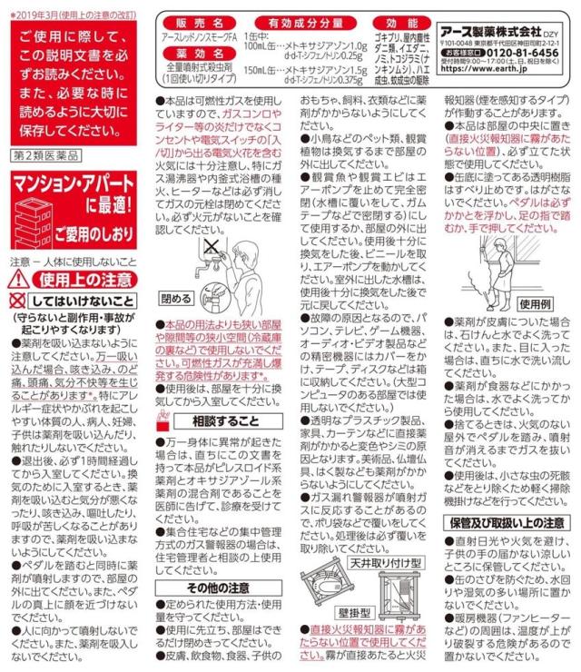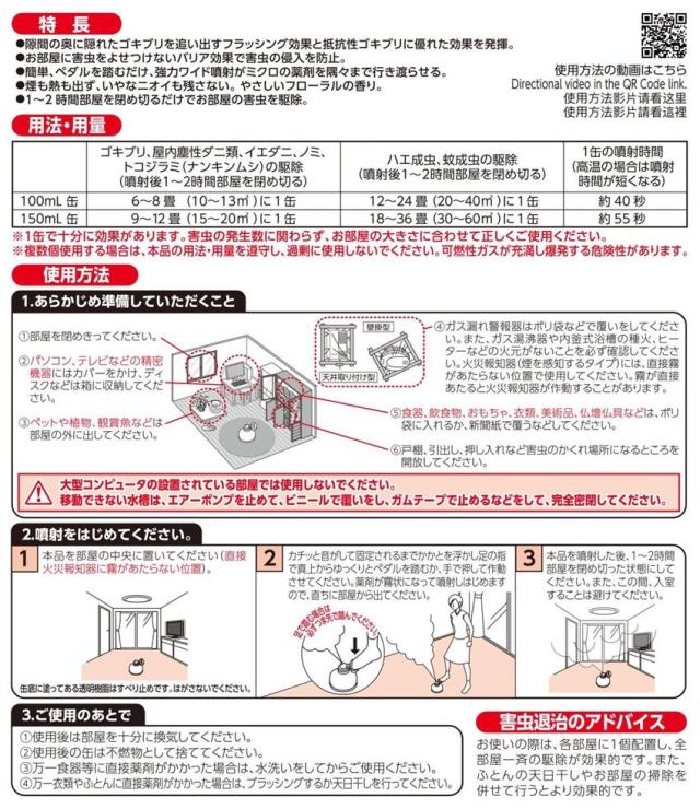 ■してはいけないこと (守らないと副作用・事故が起こりやすくなります) ●薬剤を吸い込まないように注意してください。万一吸い込んだ場合、咳き込み、のど痛、頭痛、気分不快等を生じることがあります。特にアレルギー症状やかぶれなどを起こしやすい体質の人、病人、妊婦、子供は薬剤を吸い込んだり、触れたりしないでください。 ●退出後、必ず1時間経過してから入室してください。換気のために入室するとき、薬剤を吸い込むと気分が悪くなったり、咳き込み、嘔吐したり、呼吸が苦しくなることがありますので、薬剤を吸い込まないようにしてください。 ●ペダルを踏むと同時に薬剤が噴射しますので、部屋の外に出てください。また、ペダルの真上に顔を近づけないでください。 ●人に向かって噴射しないでください。また、薬剤を吸入しないでください。 ●本品は可燃性ガスを使用していますので、ガスコンロやライター等の炎だけでなくコンセントや電気スイッチの入/切から出る電気火花を含む火気には十分注意し、特にガス湯沸器や内釜式浴槽の種火、ヒーターなどは必ず消してガスの元栓は閉めてください。必ず火元がないことを確認してください。 ●本品の用法よりも狭い部屋や隙間等の狭小空間(冷蔵庫の裏など)で使用しないでください。可燃性ガスが充満し爆発する危険性があります。 ●使用後は、部屋を十分に換気してから入室してください。 ■相談すること ●万一身体に異常が起きた場合は、直ちにこの文書を持って本品がピレスロイド系薬剤とオキサジアゾール系薬剤の混合剤であることを医師に告げて、診療を受けてください。 ●集合住宅などの集中管理方式のガス警報器の場合は、住宅管理者と相談の上使用してください。 その他の注意 ■その他の注意 ●定められた使用方法・使用量を守ってください。 ●使用に先立ち、部屋はできるだけ閉めきってください。 ●皮膚、飲食物、食器、子供のおもちゃ、飼料、衣類などに薬剤がかからないようにしてください。 ●小鳥などのペット類、観賞植物は換気するまで部屋の外に出してください。 ●観賞魚や観賞エビはエアーポンプを止めて完全密閉(水槽に覆いをして、ガムテープなどで密閉する)にして使用するか、部屋の外に出してください。使用後十分に換気をした後、ビニールを取り、エアーポンプを動かしてください。室外に出した水槽は、使用後十分に換気をした後で戻してください。 ●故障の原因となるので、パソコン、テレビ、ゲーム機器、オーディオ・ビデオ製品などの精密機器にはカバーをかけ、テープ、ディスクなどは箱に収納してください。(大型コンピュータのある部屋では使用しないでください。) ●透明なプラスチック製品、家具、カーテンなどに直接薬剤がかかると変色やシミの原因となります。美術品、仏壇仏具、はく製なども薬剤がかからないようにしてください。 ●ガス漏れ警報機が噴射ガスに反応することがあるので、ポリ袋などで覆いをしてください。処理後は必ず覆いを取り除いてください。 ●直接火災報知機に霧があたらない位置で使用してください。霧が直接あたると火災報知器(煙を感知するタイプ)が作動することがあります。 ●本品は部屋の中央に置き(直接火災報知器に霧があたらない位置)、必ず立てた状態で使用してください。 ●缶底に塗ってある透明樹脂はすべり止めです。はがさないでください。ペダルは必ずかかとを浮かし、足の指で踏むか、手で押してください。 ●薬剤が皮膚についた場合は、石けんと水でよく洗ってください。また、目に入った場合は、直ちに水で洗い流してください。 ●薬剤が食器などにかかった場合は、水でよく洗ってから使用してください。 ●捨てるときは、火気のない屋外でペダルを踏み、噴射音が消えるまでガスを抜いてください。 ●使用後は、小さな虫の死骸などをとり除くため軽く掃除機掛けなどを行ってください。