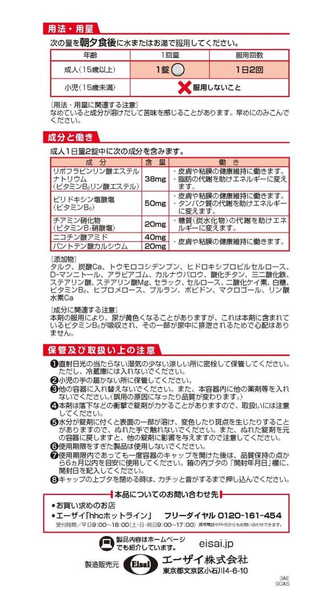 2錠中 成分:分量 リボフラビンリン酸エステルナトリウム:38mg ピリドキシン塩酸塩:50mg チアミン硝化物:20mg ニコチン酸アミド:40mg パントテン酸カルシウム:20mg