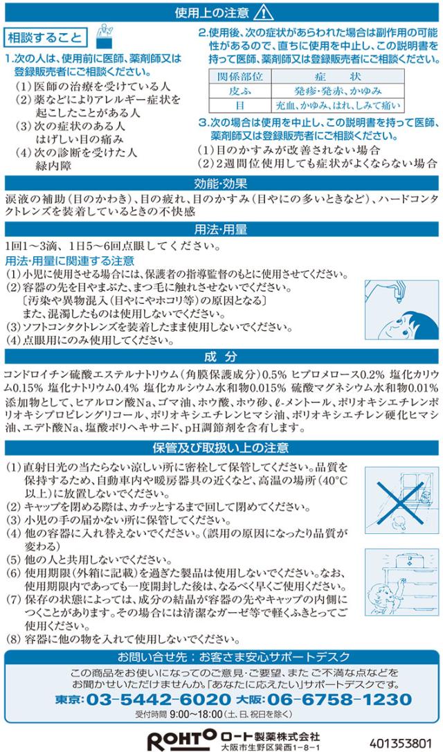 成分:分量 コンドロイチン硫酸エステルナトリウム:0.5% ヒプロメロース(ヒドロキシプロピルメチルセルロース):0.2% 塩化カリウム:0.15% 塩化ナトリウム:0.4% 塩化カルシウム水和物:0.015% 硫酸マグネシウム水和物:0.01%