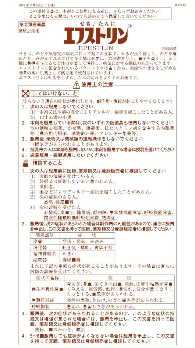 ■してはいけないこと (守らないと現在の症状が悪化したり、副作用・事故が起こりやすくなります) 1.次の人は服用しないでください (1)本剤又は本剤の成分によりアレルギー症状を起こしたことのある人。 (2)12才未満の小児 2.本剤を服用している間は、次のいずれの医薬品も使用しないでください 他の鎮咳去痰薬、かぜ薬、鎮静薬、抗ヒスタミン剤を含有する内服薬等(鼻炎用内服薬、乗物酔い薬、アレルギー用薬等) 3.服用後、乗物又は機械類の運転操作をしないでください (眠気等があらわれることがあります。) 4.授乳中の人は本剤を服用しないか、本剤を服用する場合は授乳を避けてください 5.過量服用・長期連用しないでください ■相談すること 1.次の人は服用前に医師、薬剤師又は登録販売者に相談してください (1)医師の治療を受けている人。 (2)妊婦又は妊娠していると思われる人。 (3)高齢者。 (4)薬などによりアレルギー症状を起こしたことがある人。 (5)次の症状のある人。 高熱、排尿困難 (6)次の診断を受けた人。 心臓病、高血圧、糖尿病、緑内障、甲状腺機能障害、呼吸機能障害、閉塞性睡眠時無呼吸症候群、肥満症 2.服用後、次の症状があらわれた場合は副作用の可能性があるので、直ちに服用を中止し、この文書を持って医師、薬剤師又は登録販売者に相談してください [関係部位:症状] 皮膚:発疹・発赤、かゆみ 消化器:吐き気・嘔吐、食欲不振 精神神経系:めまい 泌尿器:排尿困難 まれに下記の重篤な症状が起こることがあります。その場合は直ちに医師の診療を受けてください。 [症状の名称:症状] ●再生不良性貧血:青あざ、鼻血、歯ぐきの出血、発熱、皮膚や粘膜が青白くみえる、疲労感、動悸、息切れ、気分が悪くなりくらっとする、血尿等があらわれる。 ●無顆粒球症:突然の高熱、さむけ、のどの痛み等があらわれる。 ●呼吸抑制:息切れ、息苦しさ等があらわれる。 3.服用後、次の症状があらわれることがあるので、このような症状の持続又は増強が見られた場合には、服用を中止し、この文書を持って医師、薬剤師又は登録販売者に相談してください 便秘、口のかわき、眠気 4.5〜6回服用しても症状がよくならない場合は服用を中止し、この文書を持って医師、薬剤師又は登録販売者に相談してください