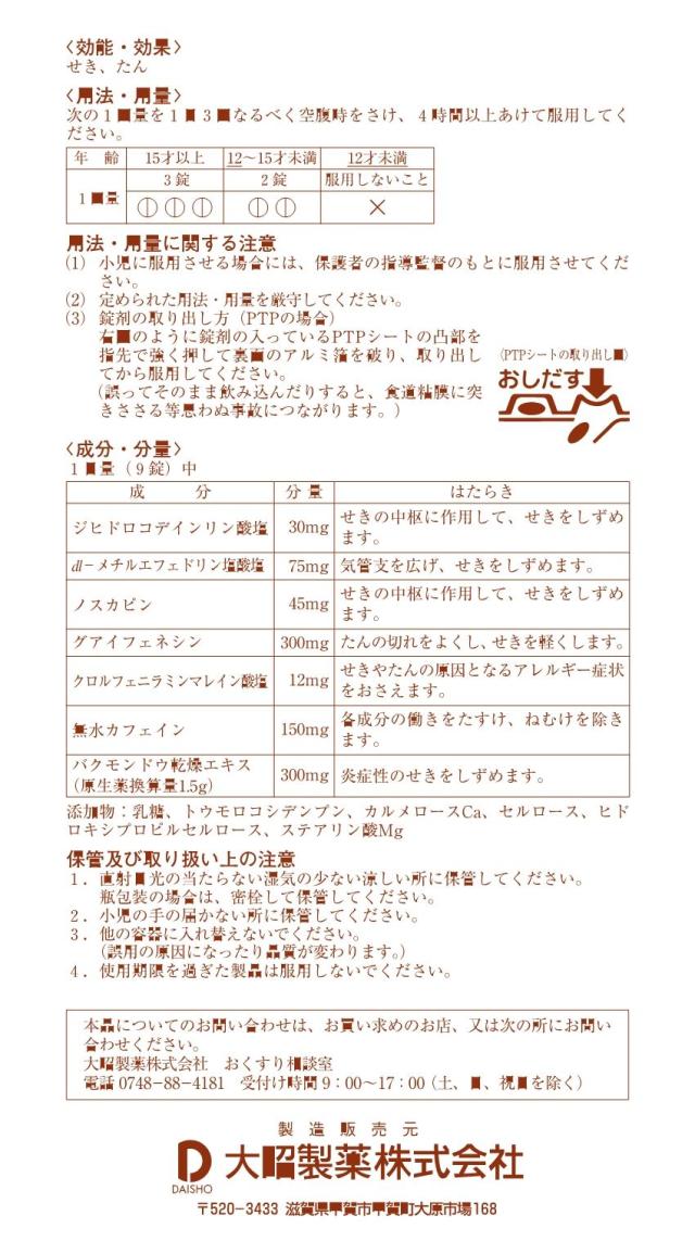 1日量(9錠中) 成分:分量:内訳 ジヒドロコデインリン酸塩:30mg: dl-メチルエフェドリン塩酸塩:75mg: ノスカピン:45mg: グアイフェネシン:300mg: クロルフェニラミンマレイン酸塩:12mg: 無水カフェイン:150mg: バクモンドウ乾燥エキス:300mg:(原生薬換算量1.5g)