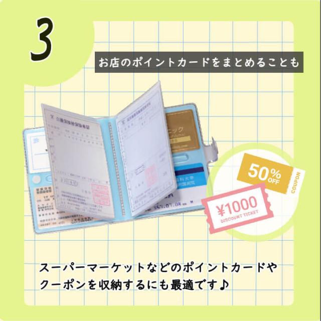 保険証や診察券の収納の用途以外でも、スーパーマーケットやお店のポイントカードを収納するのにも最適です。