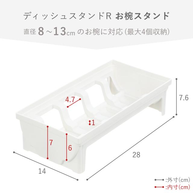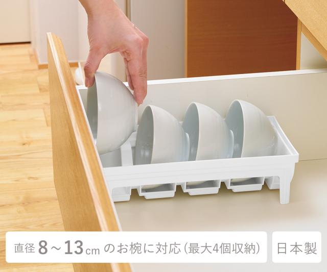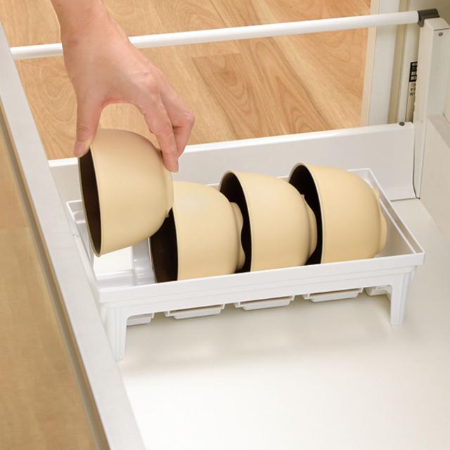直径8〜13cmまでのお椀や茶碗、ボウルを4個まで収納できる引き出し用お椀スタンドです。食器を支える部分には段差が付いているので、浅・深どちらの形状の食器も立てかけられます。