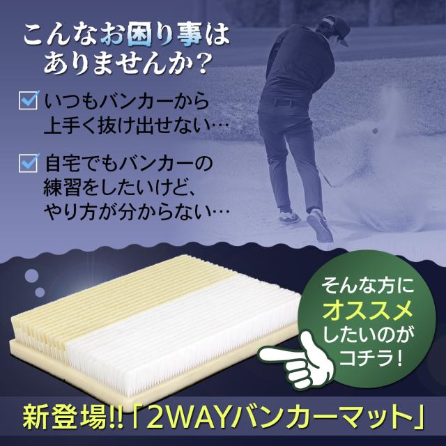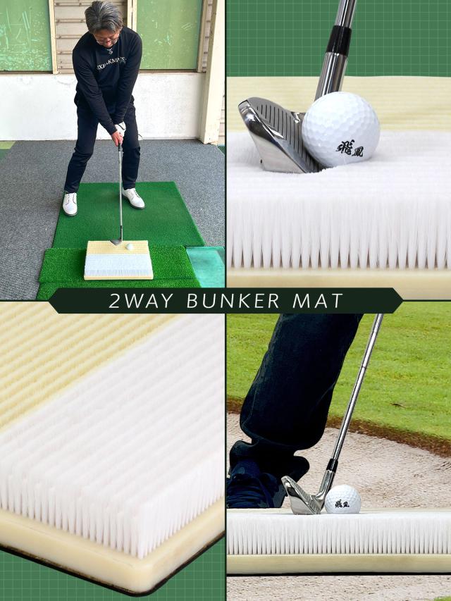 フェアウェイバンカーとグリーン周りのバンカーを再現した2WAYバンカーマットの登場!特徴や打ち方を覚えることで、実際のバンカーへの応用も利くようになっていきます。