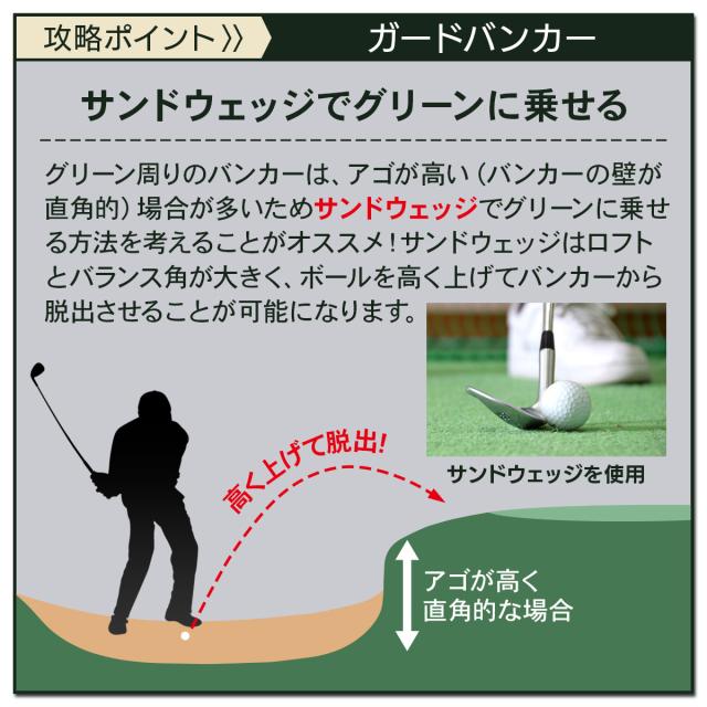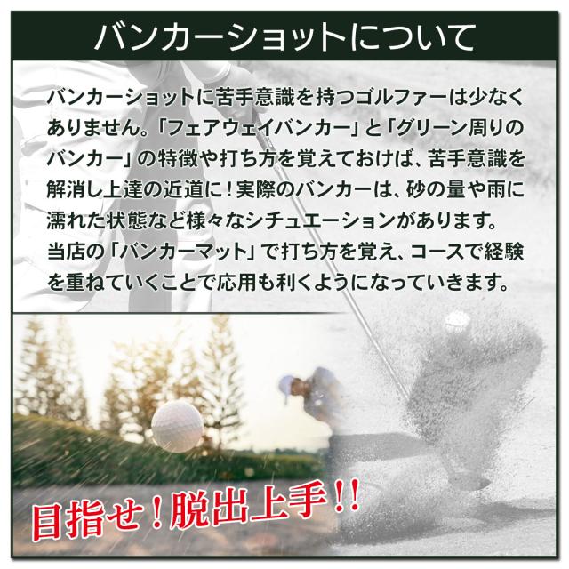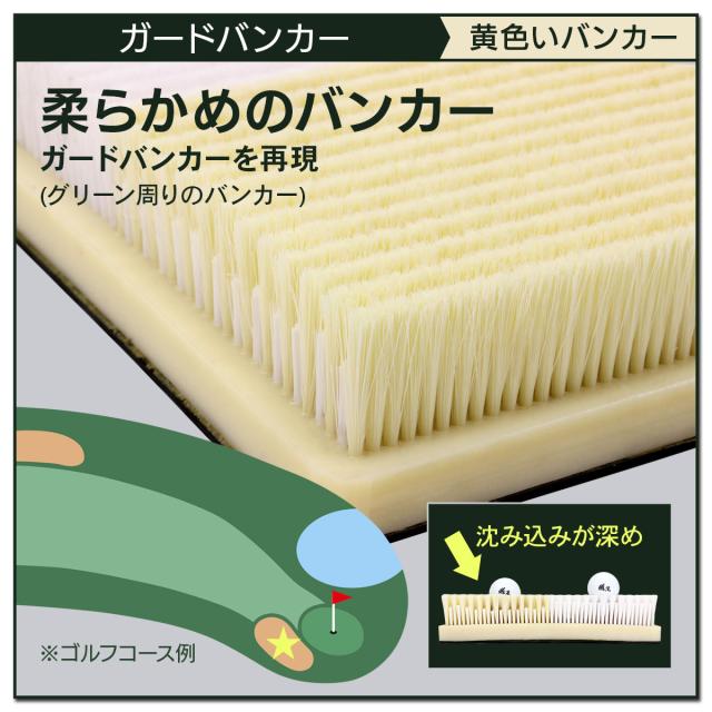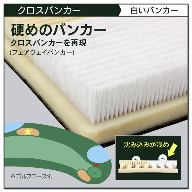 【実際のコースを想定した2種類のバンカーを再現】バンカーには大きく分けて「クロスバンカー(フェアウェイバンカー)」と「ガードバンカー(グリーン周りのバンカー)」があり、更に実際のバンカーは砂の量、天気などで様々なシチュエーションがあります。当店のバンカーマットで特徴と打ち方を覚えておけば、経験を重ねていくことで応用が利くようになっていきます。