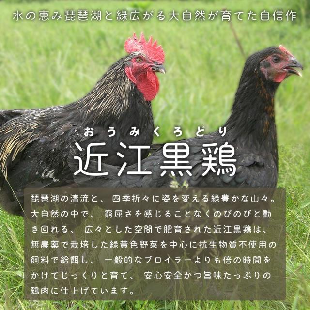 琵琶湖の清流と大自然の中で窮屈さを感じることなくのびのびと育った近江黒鶏は、一般的なブロイラーの飼育期間の2倍の95日を経て鶏肉本来の旨みが凝集されています。