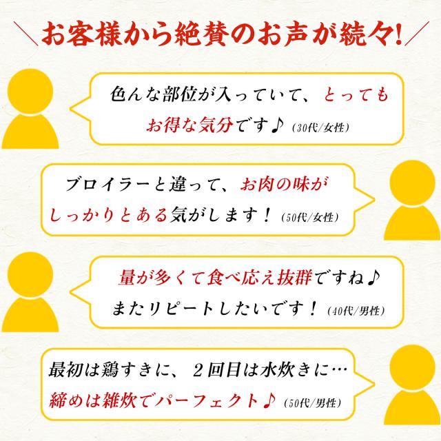 今回お届けするのは、すき焼き・焼肉用にカットされた鶏肉半羽分を余すこと無く処理したもので、各部位の味わいの違いを存分に楽しんで頂けます。750gの大容量でのお届けになりますので、3~4人で食べても十分にご満足いただけます。