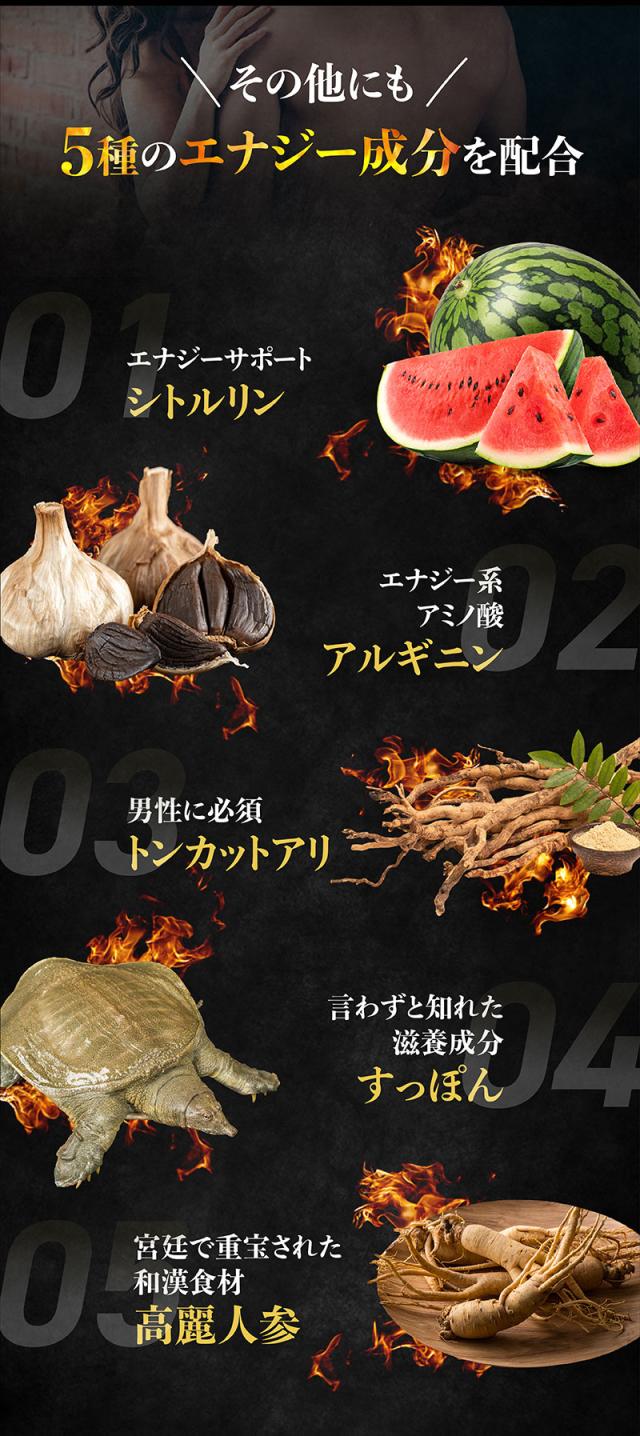| 原材料 | マカエキス末(ペルー製造)、スッポン粉末、キノコ混合粉末(霊芝、エリンギ、アガリクス、鹿角霊芝、冬虫夏草、チャーガ、マイタケ、メシマコブ、山伏茸、ハナビラタケ、タモギタケ、シイタケ、シロキクラゲ、ヒハツ)、トンカットアリ抽出物、黒コショウ抽出物、L-シトルリン、オタネニンジン抽出物、植物発酵エキス末、ミネラル酵母混合粉末(マンガン・亜鉛・銅・モリブデン・ヨウ素・セレン・クロム含有)、動植物混合粉末(マカ粉末、ムクナ粉末、アカガウクルア粉末、デキストリン、エゾウコギエキス末、アメリカ人参粉末、セレン含有酵母、韮種粉末、ウミヘビ粉末、マムシ粉末、冬虫夏草菌糸体末、ジンジャーエキス末、フィッシュコラーゲン、蟻粉末、スッポンエキス末、マカエキス末、タツノオトシゴエキス末)/セルロース、グルコン酸亜鉛、ステアリン酸Ca、微粒酸化ケイ素、CMC、L-アルギニン、V.C、ナイアシン、V.E、パントテン酸Ca、V.B1、V.B6、V.A、V.B2、葉酸、V.D、V.B12、(一部にキウイフルーツ・大豆・バナナ・もも・りんご・ゼラチンを含む) |