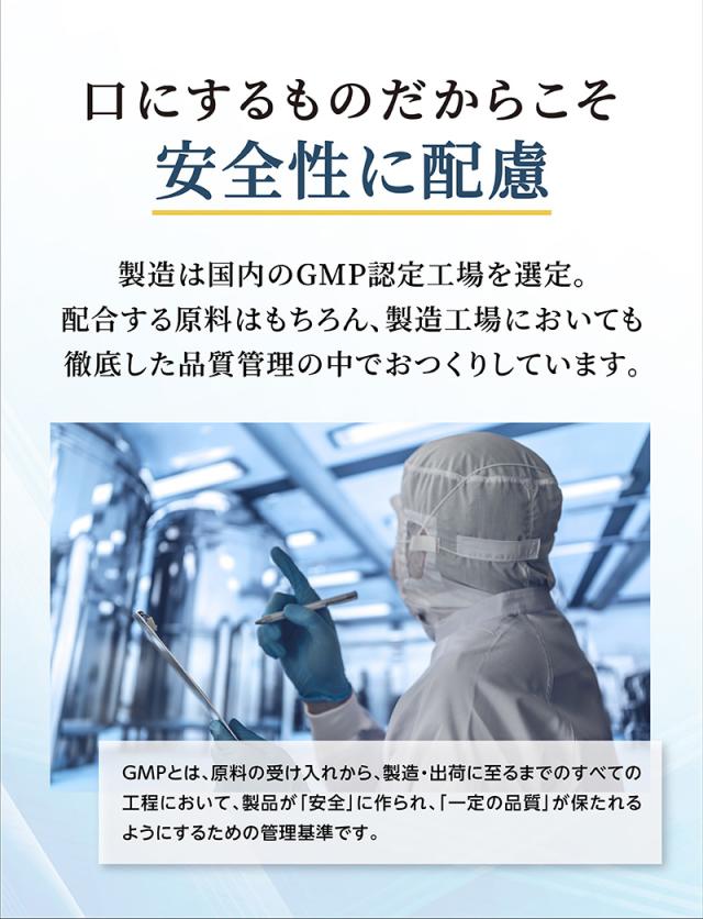さらに、国内GMP認定工場で製造し、安心していただけるサプリをご提供できるよう、 徹底した品質管理のもと製造を行っております。