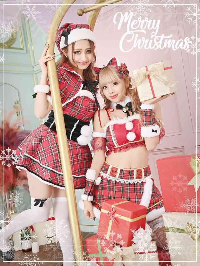 ☆セクシーな大胆肌魅せで大人な色気をアピールしつつ、女の子らしいガーリーなチェック柄の相性がバッチリなギャルサンタコスプレになっています。