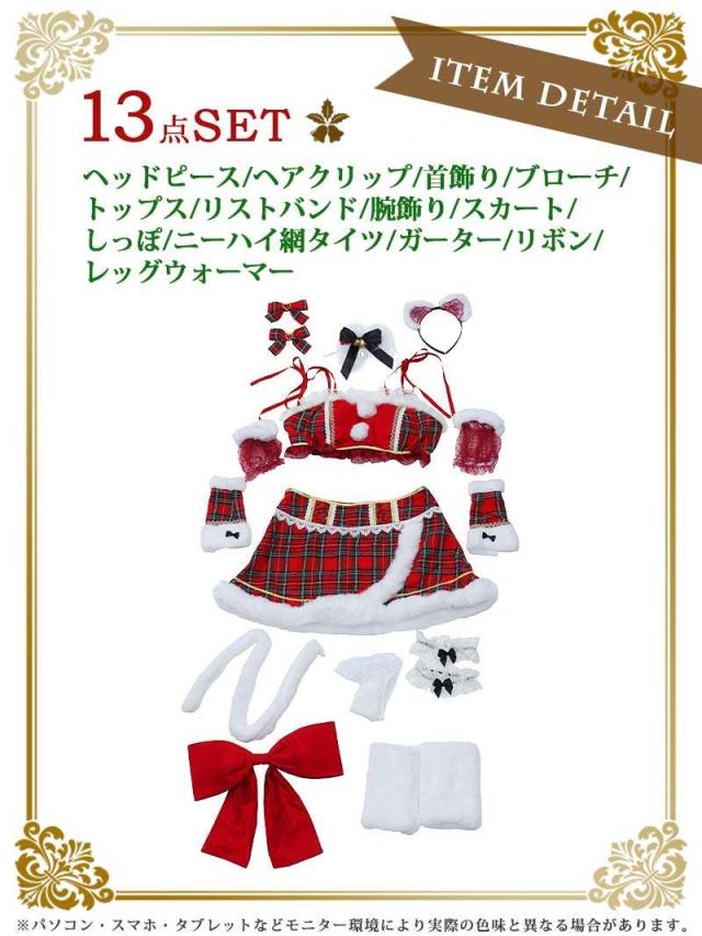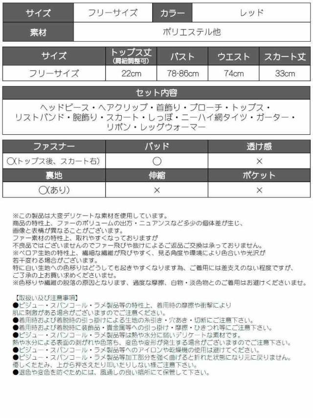 セット内容:ヘッドピース・ヘアクリップ・首飾り・ブローチ・トップス・リストバンド・腕飾り・リボン・スカート・ガーター・ニーハイ網タイツ・レッグウォーマー・しっぽ