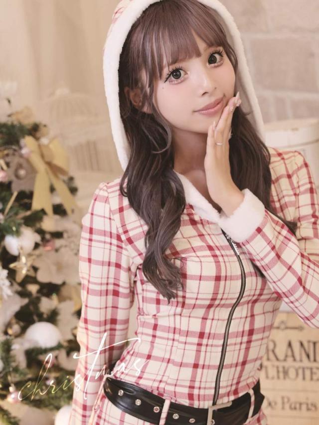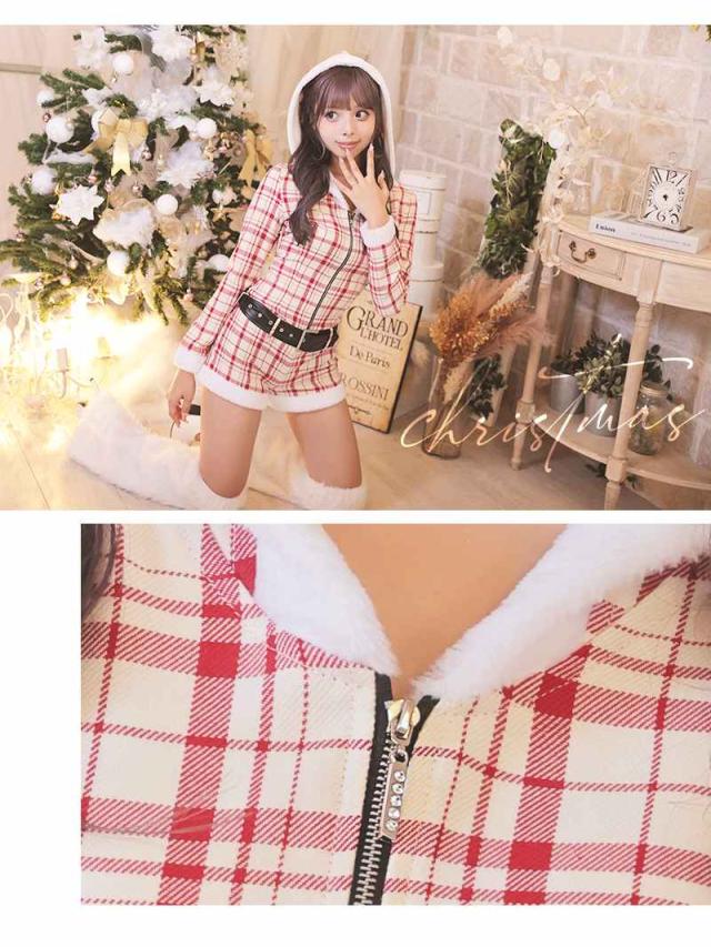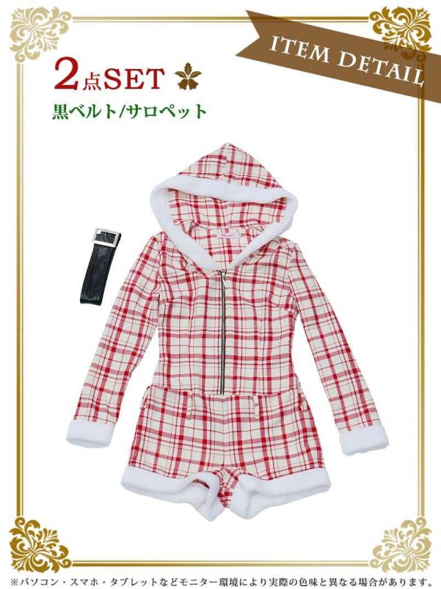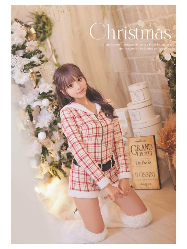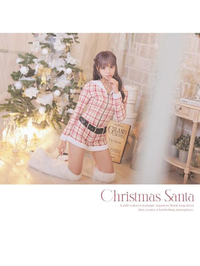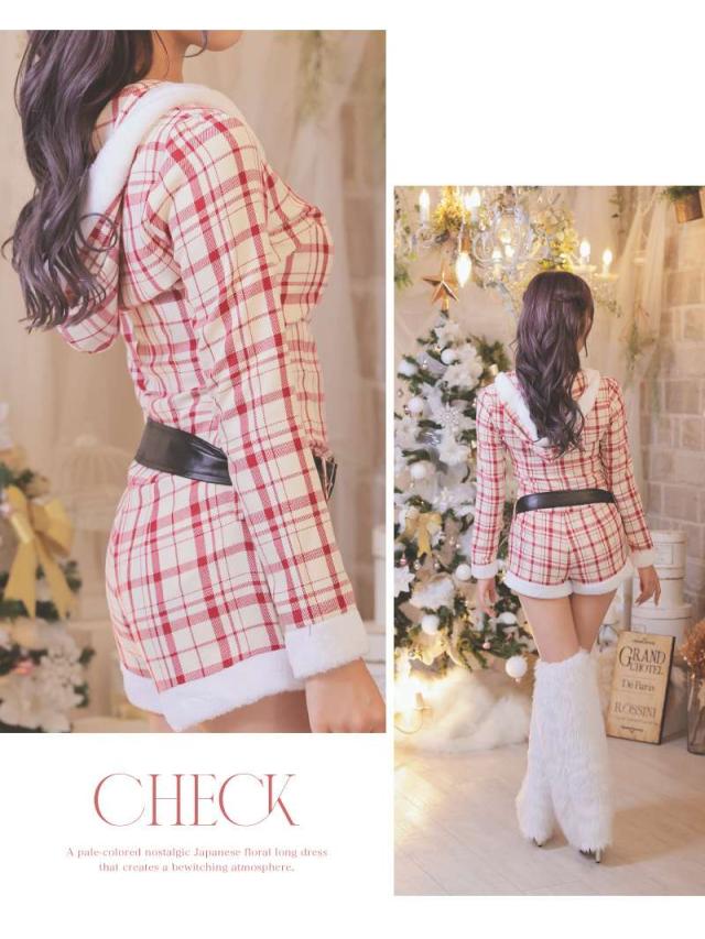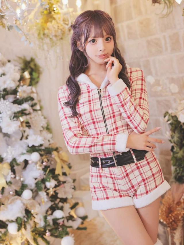 ☆ロンパース型のサンタコスプレは白地に赤の大ぶりチェック柄が映える他とは一味違うギャルサンタコスプレ。