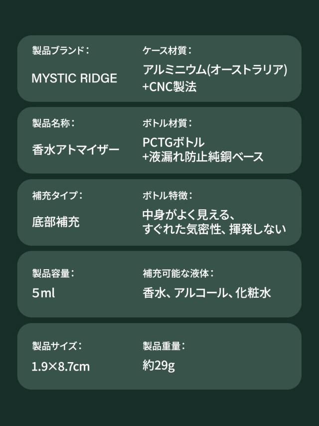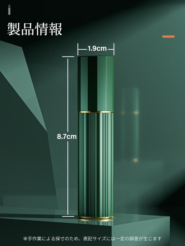 製品名称:香水アトマイザー Ver.2 補充タイプ:底部補充 製品容量:5ml 製品サイズ:1.9×8.7cm 製品重量:約29g ケース材質:アルミニウム(オーストラリア)+CNC製法 ボトル材質:PCTGボトル+液漏れ防止純銅ベース ボトル特徴:中身がよく見える、すぐれた気密性、揮発しない 補充可能な液体:香水、アルコール、化粧水 |