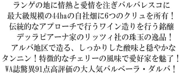 リッツィ社は、1974年、エルネスト・デッラピアーナによって、18世紀よりファミリーが所有していたブドウ園に設立されたワイナリーです。理想のワインを造ろうと決心したエルネストは、その前年、それまでの製紙事業を廃業。街を離れ、人生を賭けてランガの丘に移り住みました。以来、献身的な努力により、自身のワイナリーを、質、量、共に大きく発展させて来ました。現在、所有する60haの農園(内ブドウ畑は35ha)は、バルバレスコ生産地域において最大級の規模を誇ります。 ブドウ園は、リッツィ、ボイト、マンゾーラの隣接する3つの大きな区画とネヴィーリエ地区にあるポデーレ・ステラによって構成されています。約35haのブドウ畑の内15haでバルバレスコ用のネッビオーロを栽培し、4つのバルバレスコを造っています。他には、ドルチェット、バルベーラ、フレイサ、モスカート、そして1978年からは、ピノ・ネーロやこの地域では最も古いシャルドネも栽培しています。 近年、娘と、トリノ大学醸造学部出身で気鋭の醸造家である息子エンリコがワイン造りに参加、それぞれ経理部門と生産部門の責任者としてワイナリー経営の両輪を担っています。創業者である父、エルネストの築き上げた伝統と志を受け継ぎながら、最新の技術と設備を用い、繊細かつ洗練された多彩なワインの数々を世に送り出しています。 | ![]() ■ぶどう品種:バルベーラ種100% ■発酵・熟成:ステンレスタンクで温度コントロールされたアルコール発酵、10日間発酵、その後スラヴォニア産の大樽、コンクリートタンク、ステンレスタンクで数ヶ月熟成 ■樹齢:1967-2004年に植樹 ■土壌:白泥灰質の粘土石灰土壌と砂質土壌 ■栽培:ギュイヨ仕立て イタリア辛口赤ワイン愛好家大注目!ピエモンテ州は、白トリュフで有名なアルバ地区で造られた、しっかりした酸味と穏やかなタンニン!そして特徴的なチェリーの風味で愛好家を魅了する大人気バルベーラ・ダルバDOC!バルベーラ種100%の辛口赤ワイン! バルベーラ種100%の辛口赤ワイン。このワインはしっかりした酸味と穏やかなタンニン、特徴的なチェリーの風味で知られ、91点の高評価を受けている。ブラックベリーとプラムのブーケがあり、バランスの取れたボディと高い酸味が特徴。南向きと東向きの区画、白泥灰質と砂質の土壌で育ったブドウを使用し、伝統的な醸造法で丁寧に造られている。 |