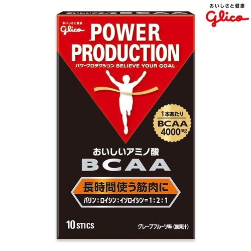 「グリコ パワープロダクション おいしいアミノ酸 BCAAスティックパウダー 10本」は、1本あたりBCAA4000mgを配合した筋持久系アミノ酸です。おいしく摂取できるグレープフルーツ風味。携帯に便利な分包タイプ。長時間運動をされる方、ウェイトトレーニングをおこなう方にオススメです。