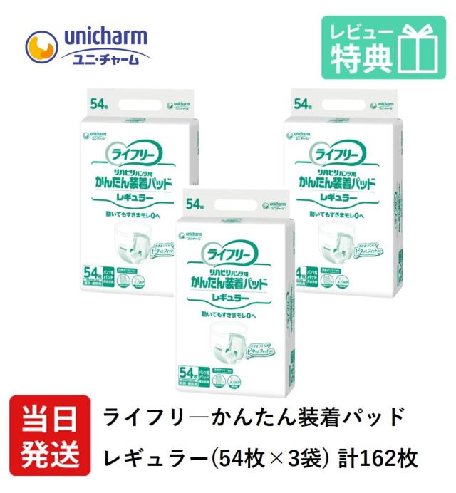 ユニチャーム ライフリー かんたん 装着 パッド レギュラー 54袋×3袋 ケース 医療費控除対象商品 尿モレ 尿取りパッド 男女兼用 大人用オムツ 大人用おむつ 紙パンツ 介護用品 リハビリ 病院 施設 シニア 旅行 尿とり 約2回吸収 昼用