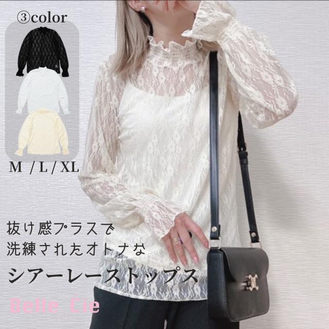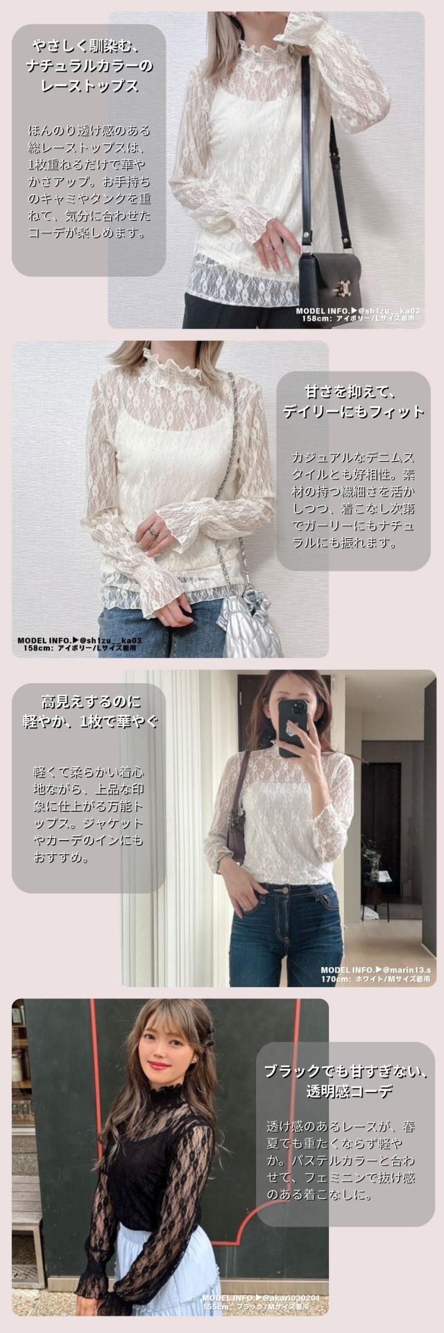 レース Tシャツ シースルー シアー トップス シャツ 長袖 フリル ハイネック 重ね着 レディース ロンT 韓国ファッション セクシー シアーシャツ おしゃれ 大人 可愛い かわいい 上品 シンプル 透け感 インナー 肌見せ 小花 柄 きれいめ 黒 白 アイボリー