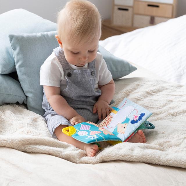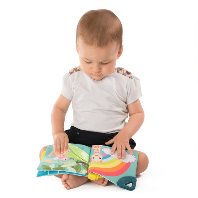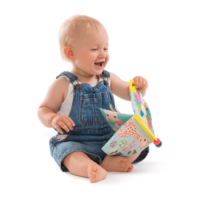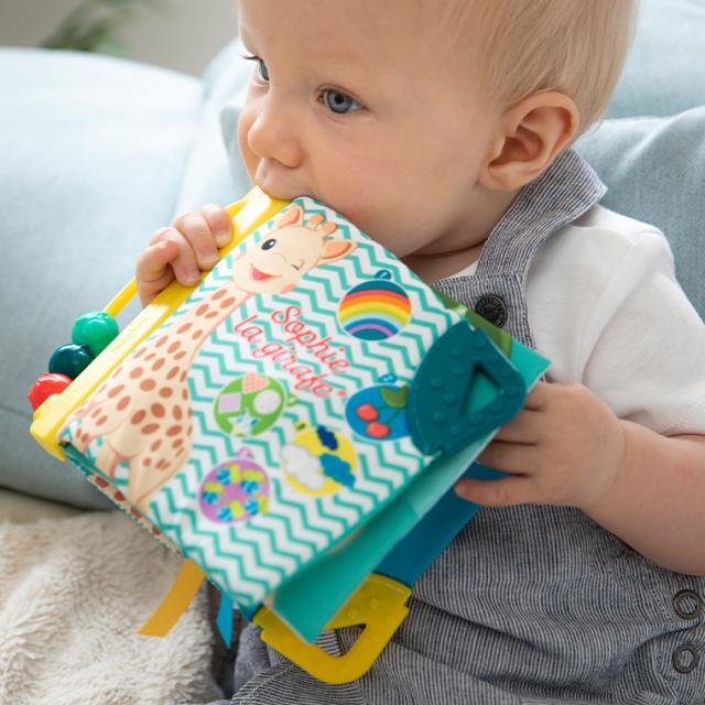 カラフルで可愛いソフィーとおともだちの絵本。持ち手のボールをさわって遊ぶこともでき、右上には歯固めもついています。