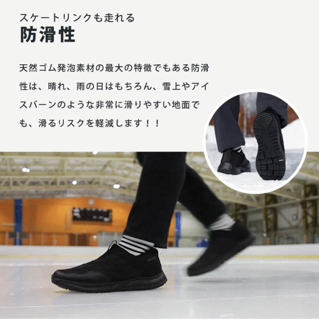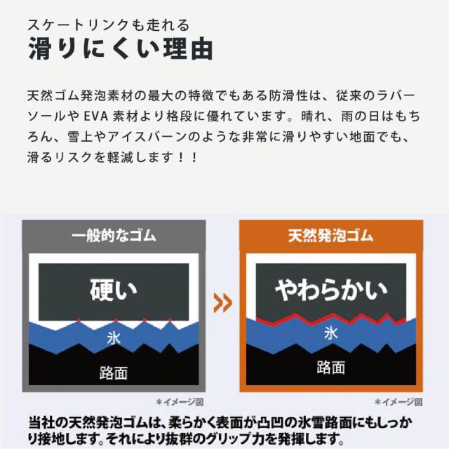 天然ゴム発泡素材のアウトソールが、氷上、雪上など非常に滑りやすいシーンでも、抜群のグリップ力を発揮!