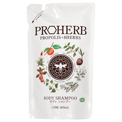 「プロハーブ EMボディシャンプー 詰替用 400ml」は、プロポリスエキス、8種類の植物成分、ヒアルロン酸、ハチミツを配合したふんわりとした泡でやさしく洗うボディシャンプーです。うるおいを残して汚れをスッキリ落とします。詰め替え用。