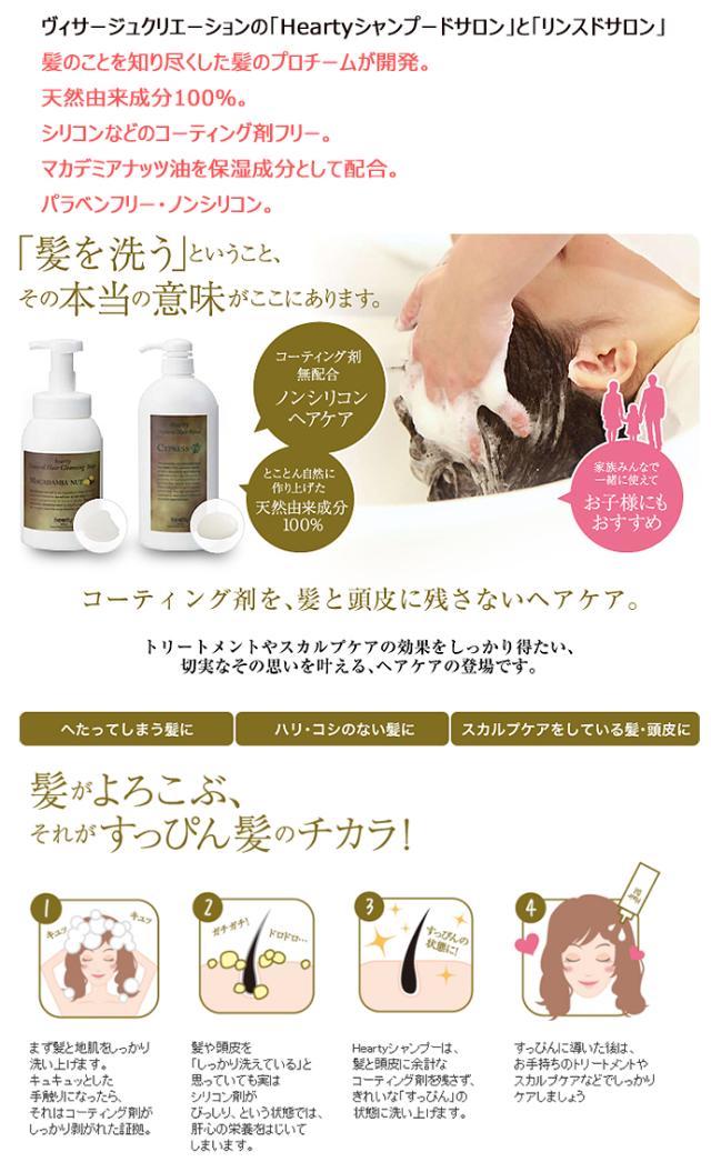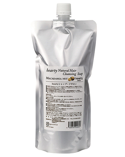 「hearty シャンプードサロン 500ml 詰替用」は、天然由来成分100%のせっけんシャンプーです。保湿成分にマカデミアナッツ油を配合。シリコンを含むコーティング剤を配合していません。泡ポンプタイプ。パラベンフリー、ノンシリコン。詰替用。