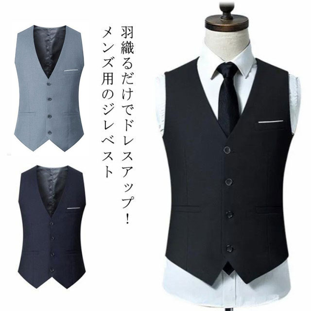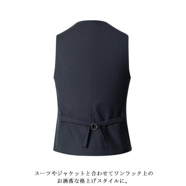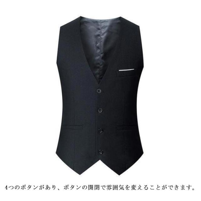 | 羽織るだけでドレスアップ!メンズ用のジレベスト 4つのボタンがあり、ボタンの開閉で雰囲気を変えることができます。 すっきりとしたシルエットがスマートな印象を与える、着やせ効果も抜群! 寒い時期にはジャケットのインナーとしてもこ着用いただけます。 スーツやジャケットと合わせてワンラック上のお洒落な格上げスタイルに。 | |