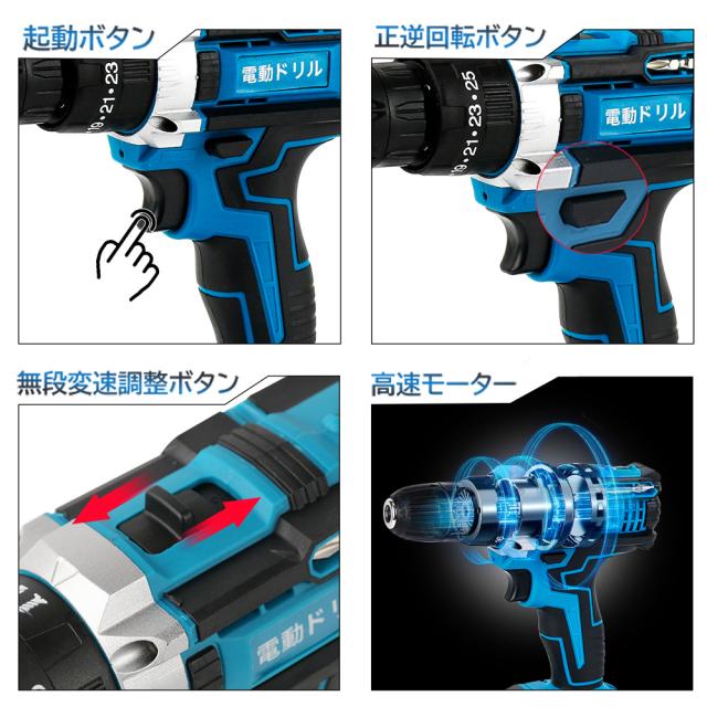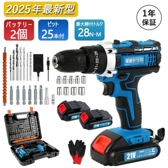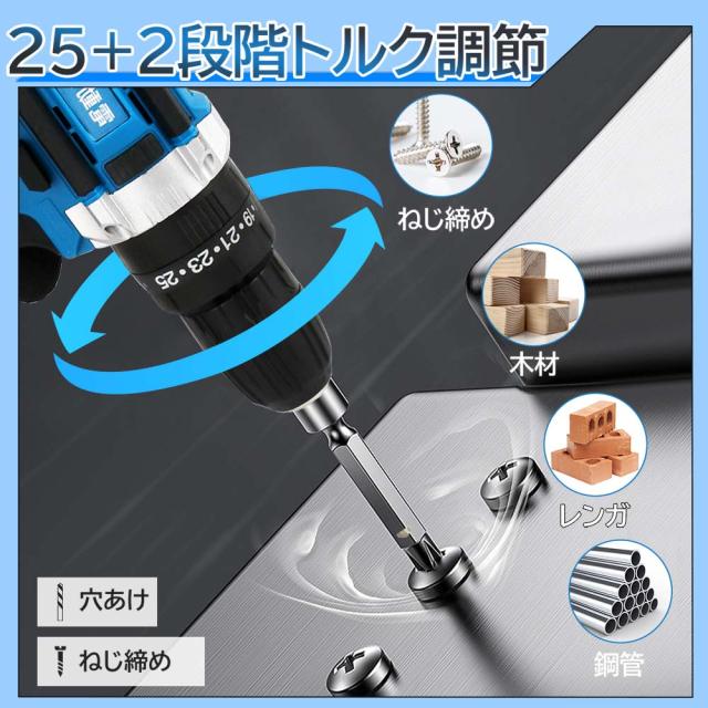 電動ドリルドライバー 7500mAh大容量バッテリー 最大28N.m 25+2段階トルク調節 LED照明 スピード調節 正逆転切替 25本ビット1本延長棒 DIY 工具セット 穴あけ 日本語取扱説明書付 (電動ドリル(2個)