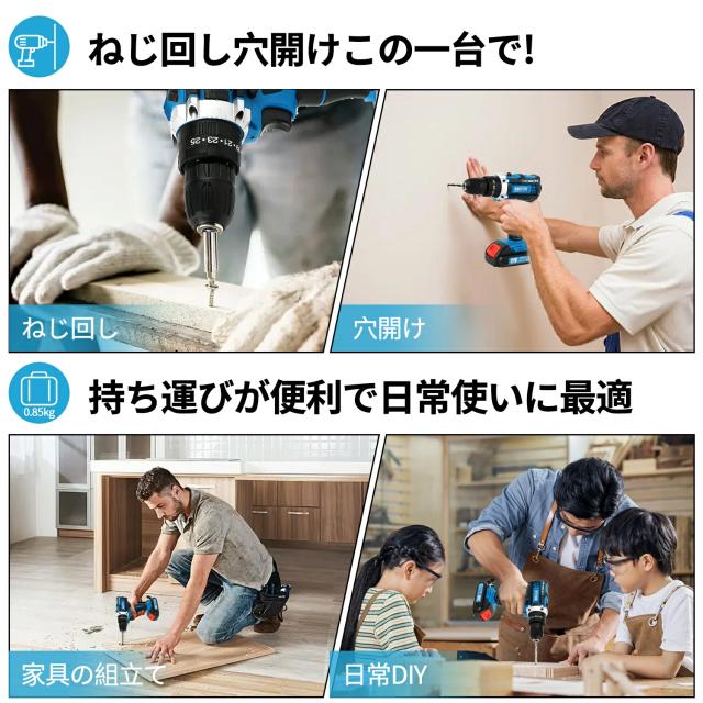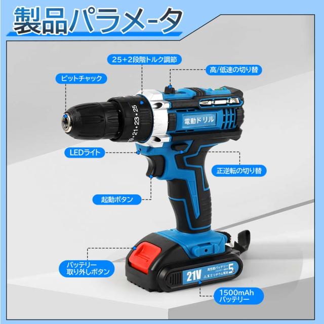 ビット*6、六角スリーブ*9* (4-12mm)、ドリルビット*7、フレキシブルシャフト*1、コネクテイングロツド*2、21V 1.5Ah バツテリー*2、ACアダプタ、収納ケース、日本語取扱説明書。家具の組み立てや、DIYの強い味方!